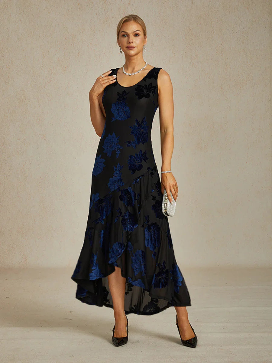 This sleeveless navy gown features an elegant asymmetrical hem and a flowing A-line silhouette. The dress is crafted from floral burnout chiffon, a lightweight, semi-sheer fabric with delicately textured floral patterns that add depth and elegance. Its fitted bodice transitions into a graceful skirt, offering both structure and fluidity. Ideal for weddings, formal dinners, or special evening occasions, this dress combines comfort, sophistication, and timeless charm.