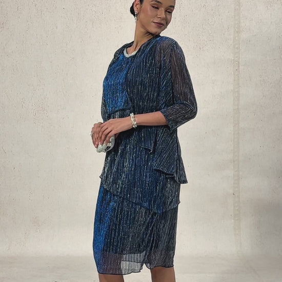 Dieses elegante, metallisch schimmernde Chiffon-Midikleid mit Plisseefalten besticht durch einen perlenbesetzten Rundhalsausschnitt und ein raffiniertes Lagen-Design, das für zusätzliche Eleganz sorgt. Das Stretchfutter garantiert hohen Tragekomfort und eine schmeichelhafte Silhouette. Perfekt für Abendveranstaltungen, Partys oder festliche Anlässe . Für einen kompletten Look kann es mit der passenden Strickjacke kombiniert werden.