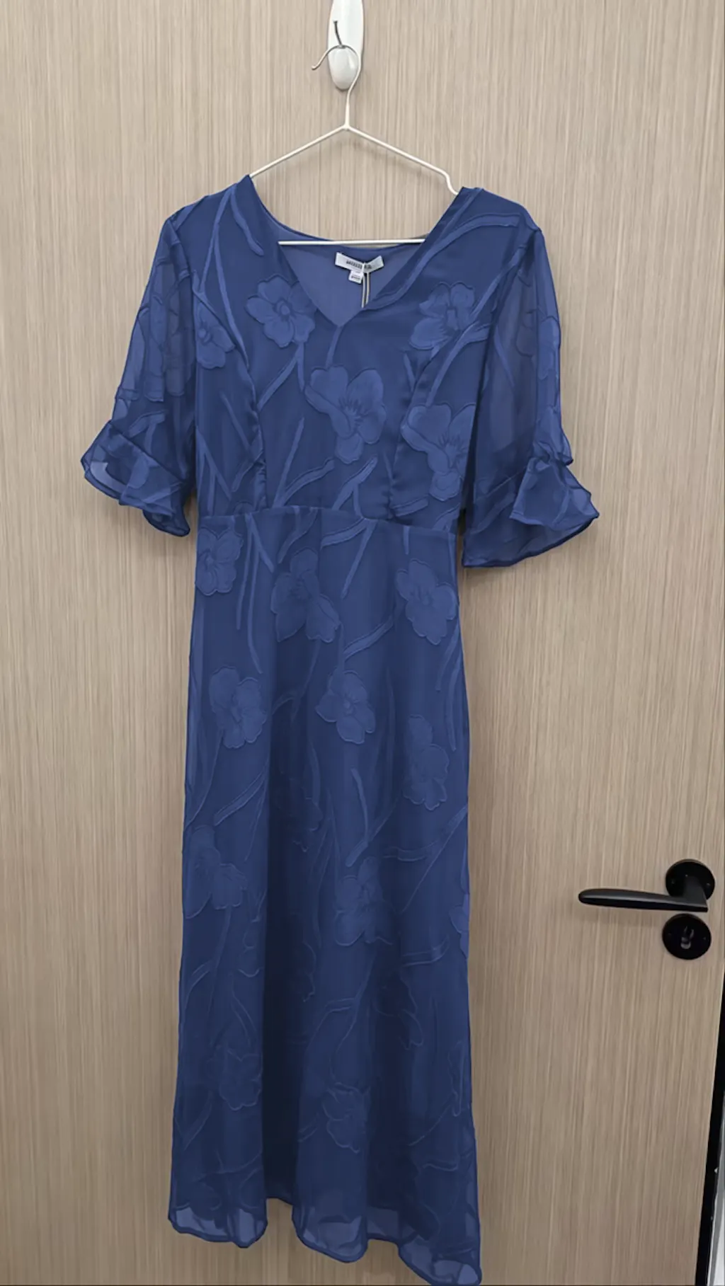 Dieses Spitzenkleid verströmt einen Hauch von Eleganz und ist ideal für Hochzeitsgäste oder Cocktailpartys. Mit seinem raffinierten V-Ausschnitt und den zarten, flatternden Ärmeln besticht das Kleid durch seine klassische A-Linien- Silhouette, die durch feine Rüschendetails zusätzlich betont wird und so seine anmutige Ausstrahlung unterstreicht.