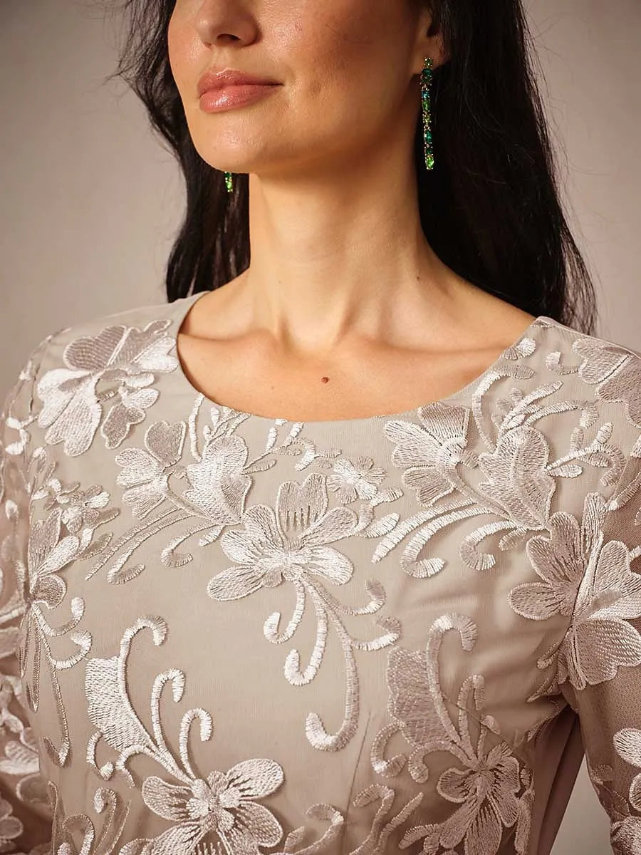 This elegant formal dress combines lace for a sophisticated look. Featuring a crew neck, ruffle and ruched details, and an A-line silhouette, it exudes timeless charm and grace.