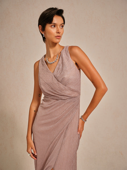 Metallic Pleated Chiffon V-Neck Maxi Dress