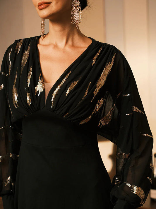 Black Sequins Puff Sleeve Maxi Dress with Empire Waist