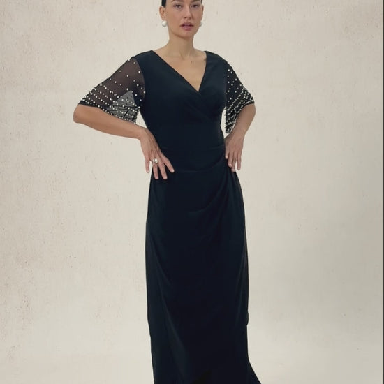 This long empire waist dress combines elegance and comfort with a v neckline and embellished flutter sleeves. The flattering silhouette accentuates the waist, while the flowy fabric allows effortless movement. Perfect for formal occasions, this dress is a must-have for your wardrobe.