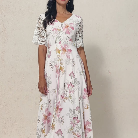 The delicate lace sleeves add a touch of elegance, while the lightweight floral chiffon creates a gentle, flowing look. The high waist A-line silhouette keeps the fit relaxed and comfortable, making it easy to wear throughout the day.