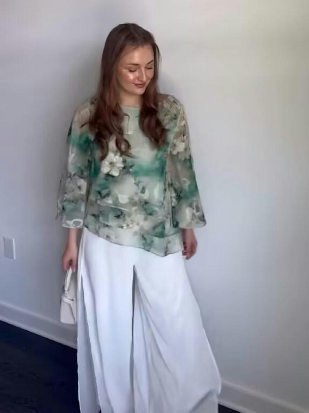 This elegant round neck top features a beautiful floral print that adds a feminine touch to your wardrobe. The layered hem design creates a graceful flow, while the lace chiffon fabric adds texture and sophistication. The 3/4 bell sleeves provide a stylish flair, and the soft knit lining ensures comfort throughout the day. Perfect for any occasion, this top pairs beautifully with ivory chiffon pants, creating a chic and refined look. Whether you're attending a wedding guest, cocktail party, this top is a versatile and elegant addition to your collection.