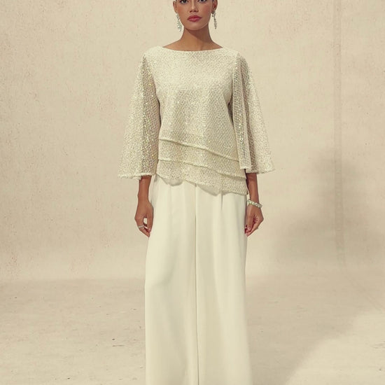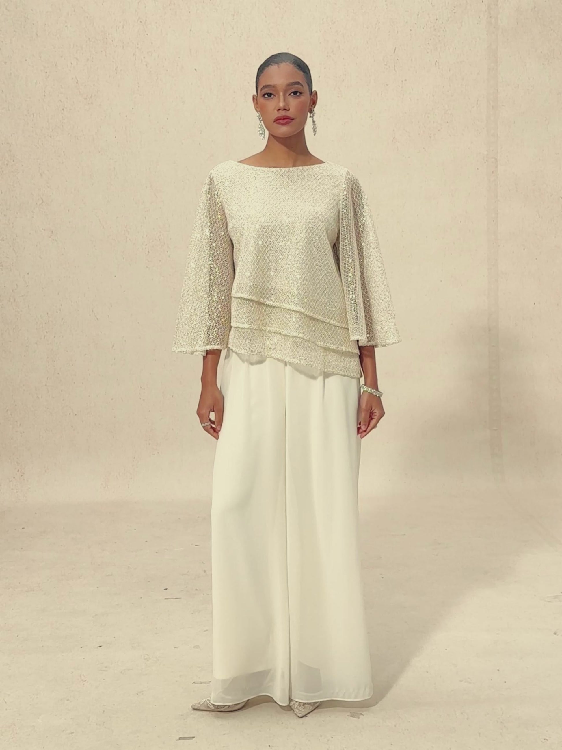 Ce haut superposé en mesh à sequins élégant présente une combinaison saisissante d'éclat et de fluidité, conçu pour vous faire briller sans effort. Les manches cloche 3/4 apportent une touche sophistiquée, tandis que la coupe ample garantit le confort sans compromettre le style. La doublure intérieure douce offre une sensation agréable sur la peau, faisant de ce haut un choix idéal pour le jour comme pour la soirée. Associez-le à un pantalon en chiffon ivoire pour un look rehaussé, parfait pour une variété d'occasions.