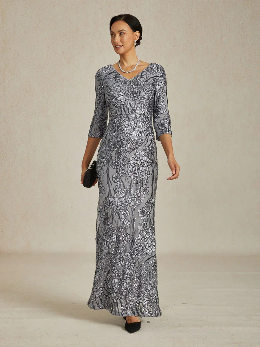 This full-length lace gown shimmers with delicate sequin embroidery, offering a refined and graceful look. The V-neckline and 3/4 sleeves create a flattering silhouette, while the soft lining ensures all-day comfort. With a subtle stretch and an elegant A-line hem, this dress moves beautifully with every step ¡ª perfect for evening events, weddings, and formal occasions.