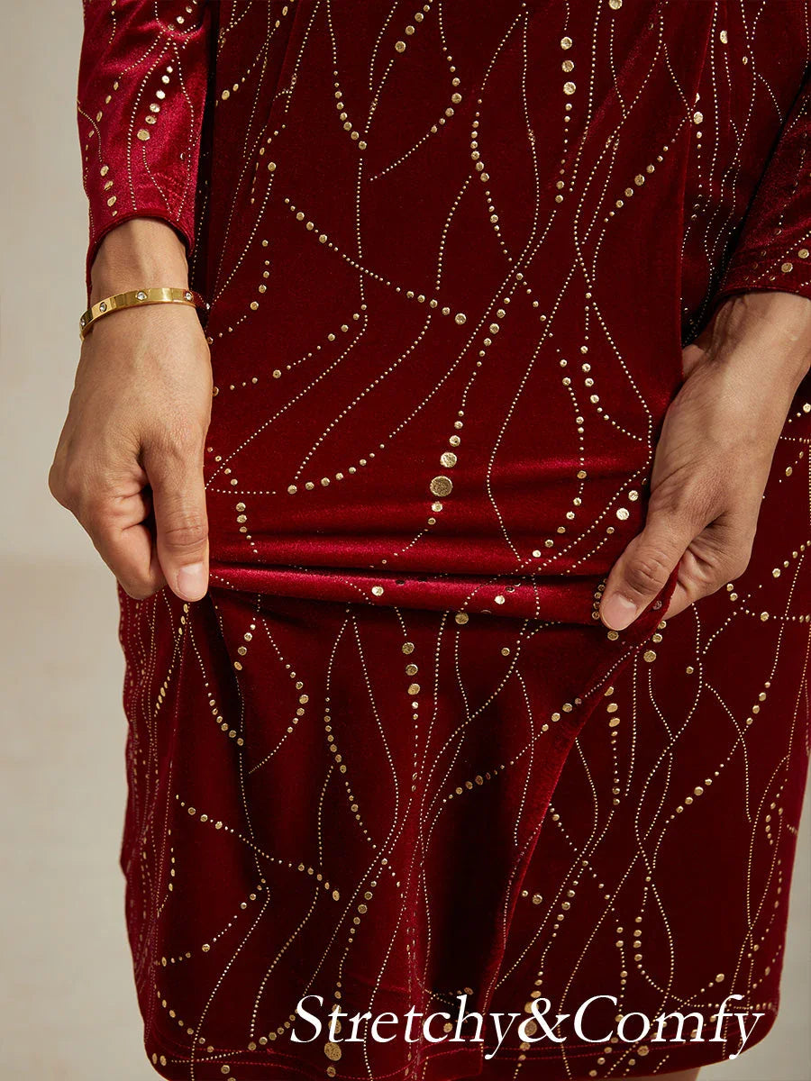 Make a dazzling entrance in this velvet blazer dress, crafted from high-stretch velvet with a subtle gold foil finish for a luminous touch. Featuring a V-neck with red satin lapels, this dress combines tailored sophistication with festive glamour. The matching belt cinches the waist for a flattering silhouette, while the back invisible zipper ensures an easy fit. Perfect for Christmas parties or elegant evening gatherings.