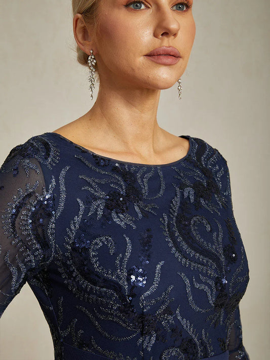 Elegant Sequin Evening Gown with Boat Neck and Slit Cuffs