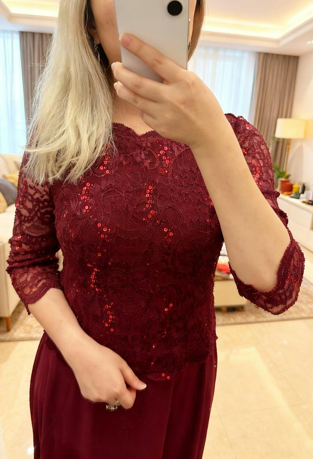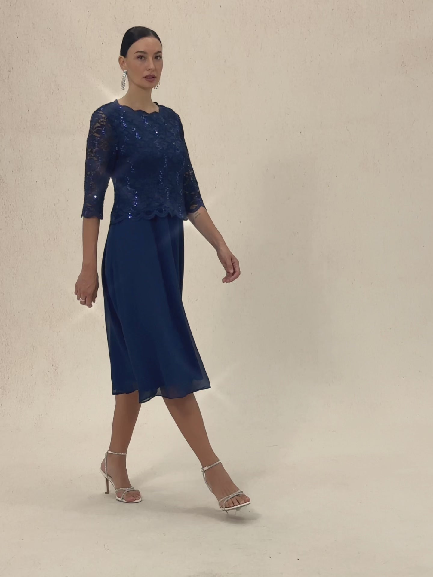 Questo raffinato abito alla lunghezza tea crea l'illusione di un completo a due pezzi con il suo corpetto in pizzo con paillettes scintillanti e la gonna fluente in chiffon. Le maniche in pizzo trasparente offrono una copertura elegante, mentre i bordi smerlati sullo scollo e sui polsini aggiungono un tocco romantico e delicato. Perfetto per le madri della sposa o dello sposo, questo modello emana un'eleganza senza tempo e una sofisticatezza senza sforzo per matrimoni e occasioni formali.