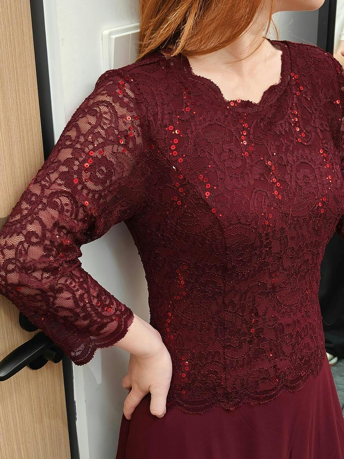 - Design: design finto due pezzi, maniche in pizzo trasparente, rifinitura in pizzo smerlato, gonna alla lunghezza tea, ricamo con paillettes