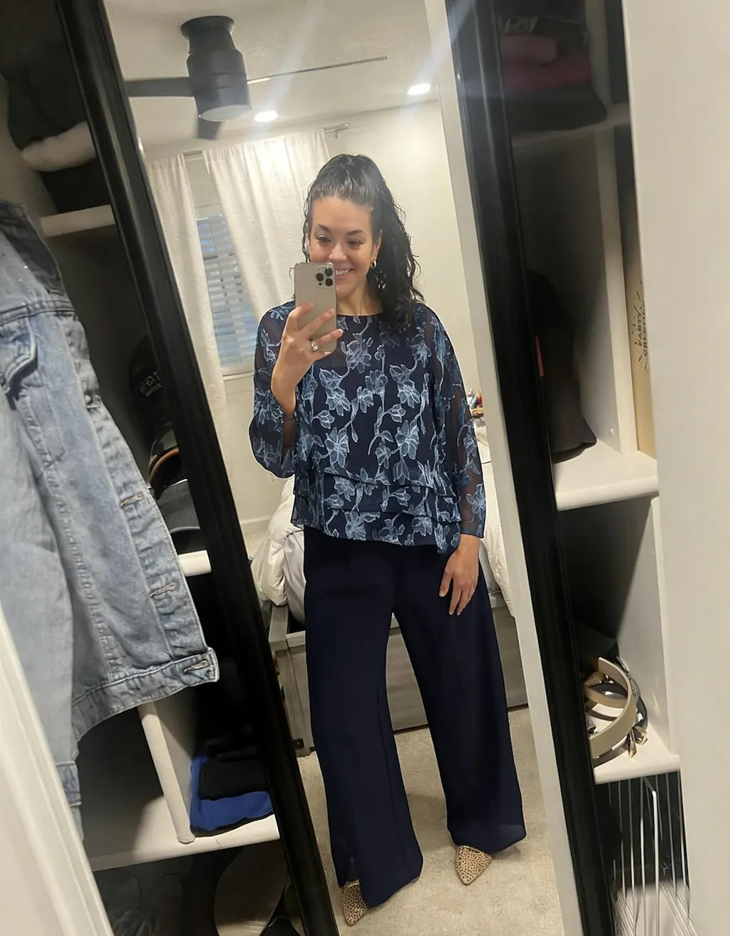 This is a very nice dressy top. I’m glad I got it! Very elegant with chiffon overlay & sleeves, comfortable too. Pullover, blouson with comfortable elastic low on waist. Wear w pants or skirt, thin fabric so you can wear jkt over it & take off for dressier look. Nice classic style!