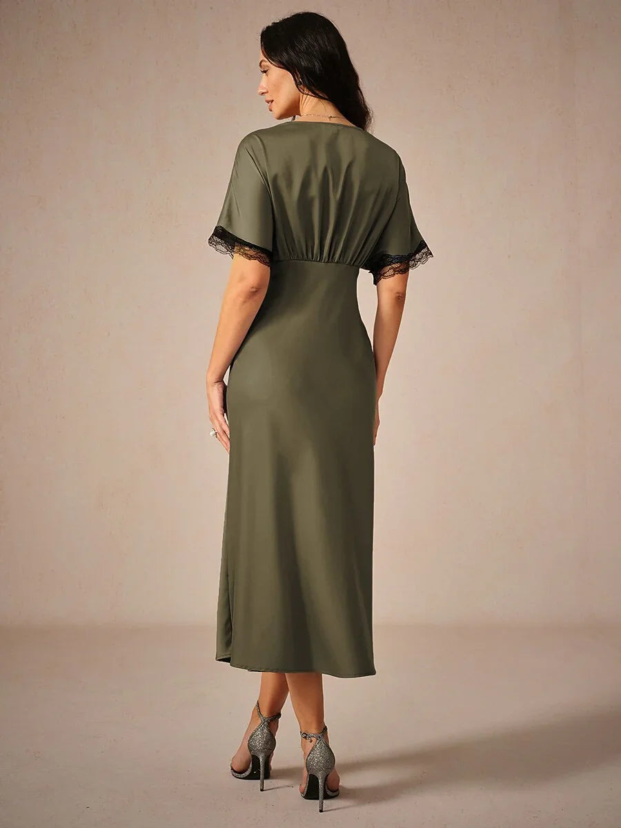 Satin Lace Trim V-Neck Dusty Blue Dress