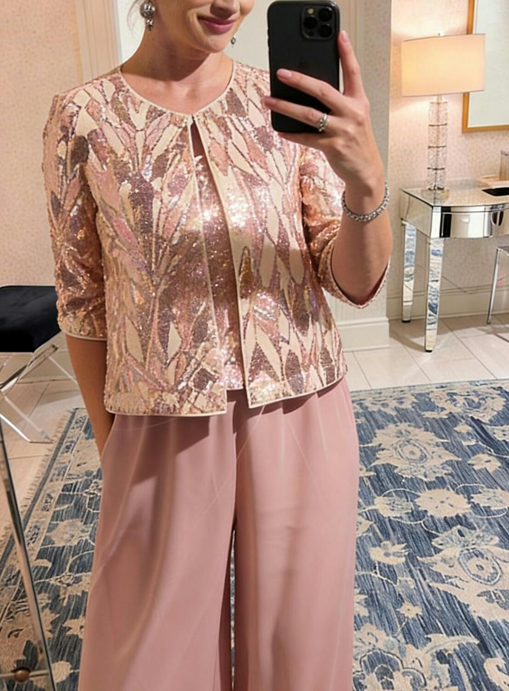 This elegant sequin mock twinset top is designed for mature women who value comfort and polish. Featuring a round neckline and 3/4 sleeves, it offers flattering coverage for the arms and neckline. The soft stretch lining feels gentle on the skin, while shoulder pads help create a balanced, structured silhouette. Finished with sequin and bead detailing, it adds refined sparkle without looking overdone. Pairs beautifully with our chiffon overlay straight-leg pants for a formal, elongating look.