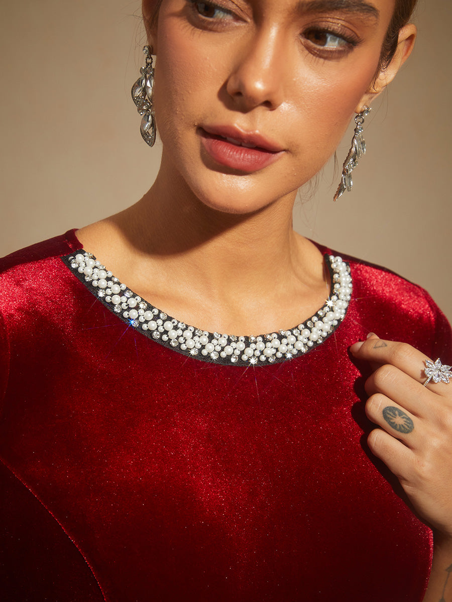 This red stretch velvet evening gown blends timeless elegance with modern sophistication. Designed with a round neckline and long slit sleeves, it features delicate beaded embellishments at the neckline and cuffs for a refined sparkle. The fitted bodice flows into a graceful mermaid hem that flatters the figure beautifully. Perfect for formal dinners, weddings, or holiday celebrations.