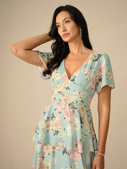 Tiered Floral High Waist Flutter Sleeve Ankle-Length Dress