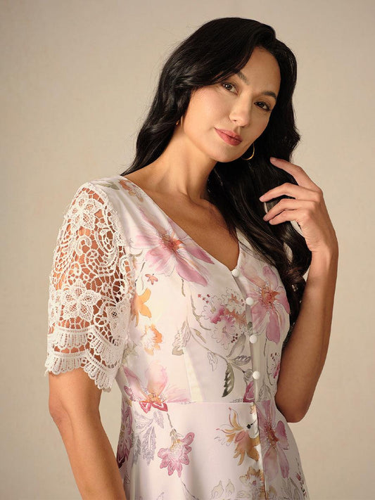 Floral Chiffon A-Line Dress with Lace Sleeves