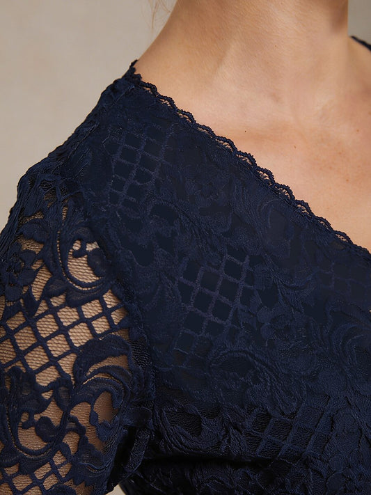 Feminine V-Neck Stretch Lace Top with Scalloped Hem