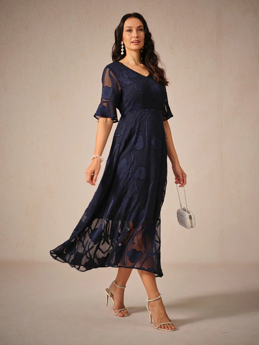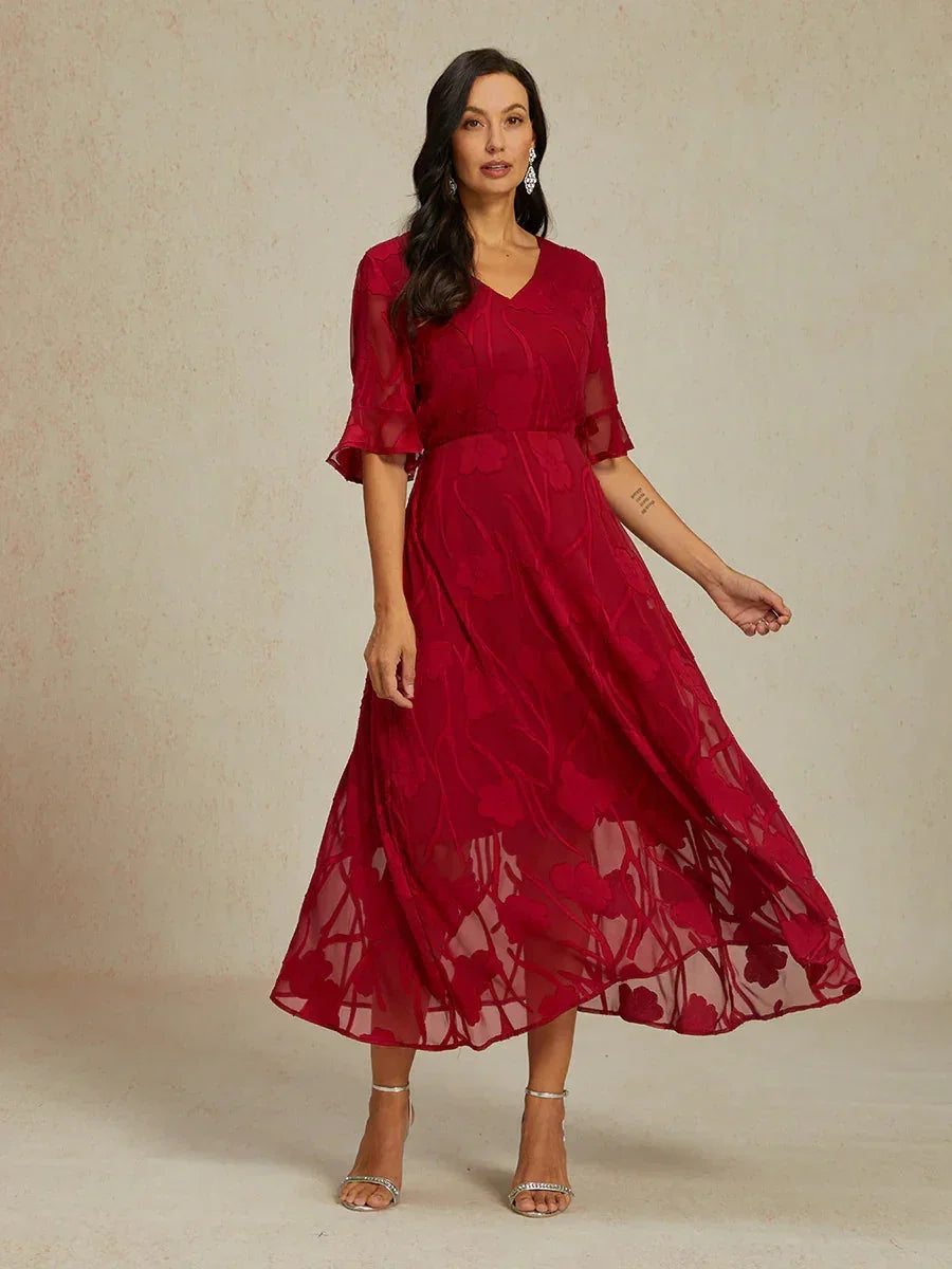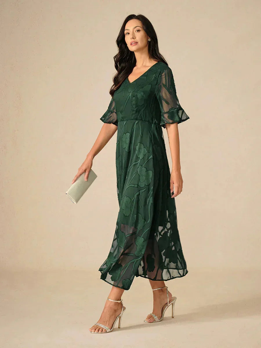 This lace dress offers a touch of elegance, ideal for a wedding guest or cocktail party look. With its refined V-neckline and soft flutter sleeves, the dress has a classic A-line silhouette accented by delicate ruffle details, enhancing its graceful appeal.