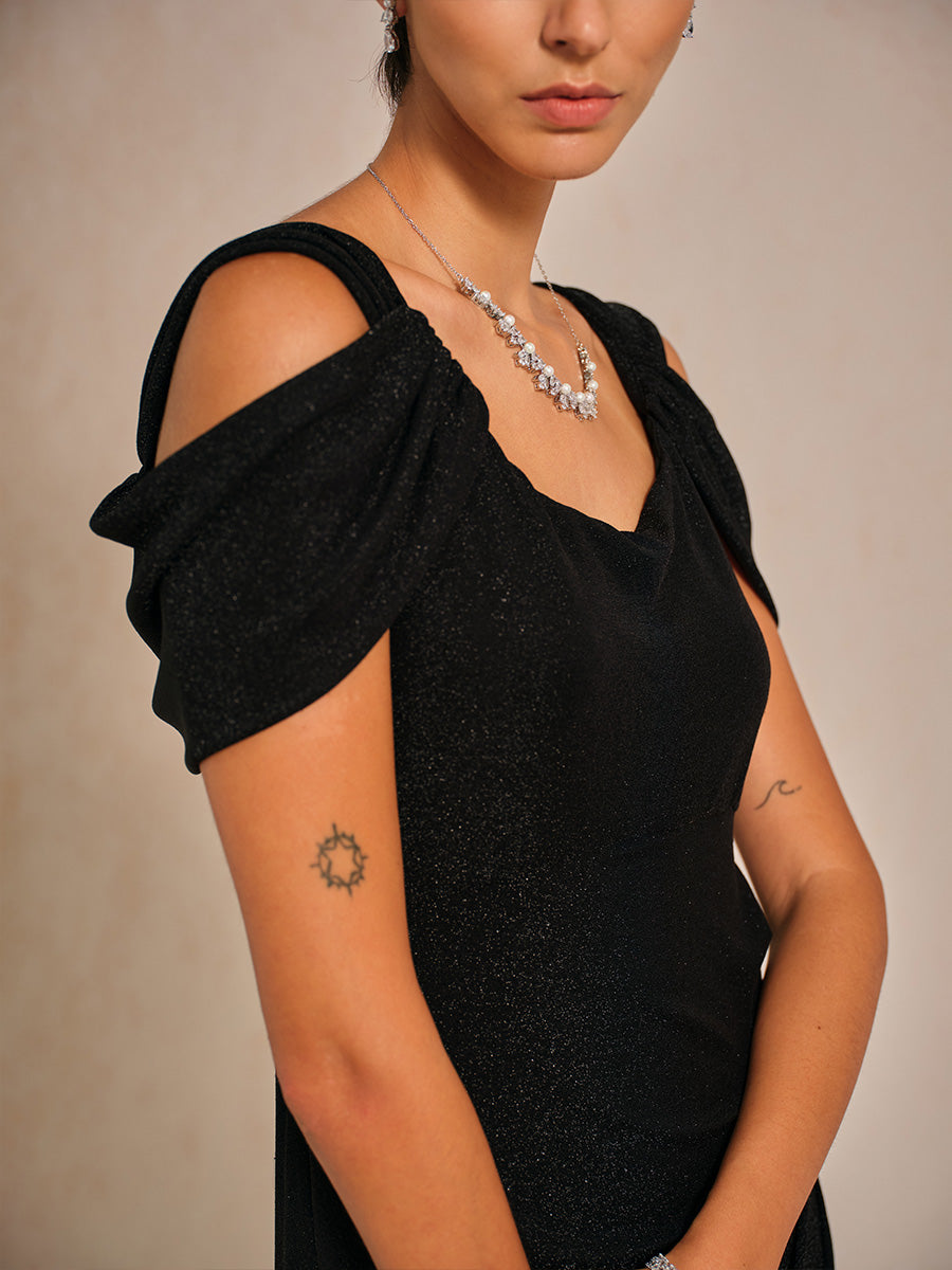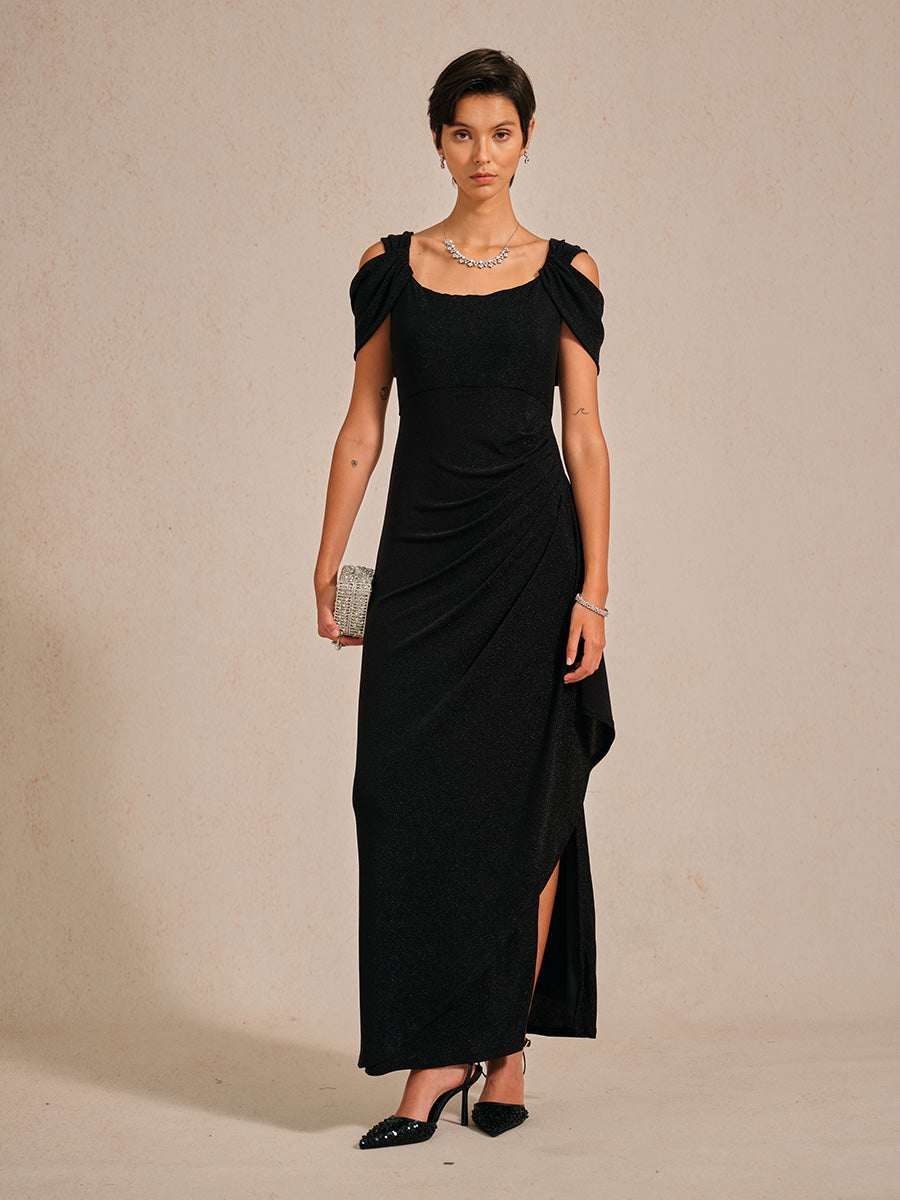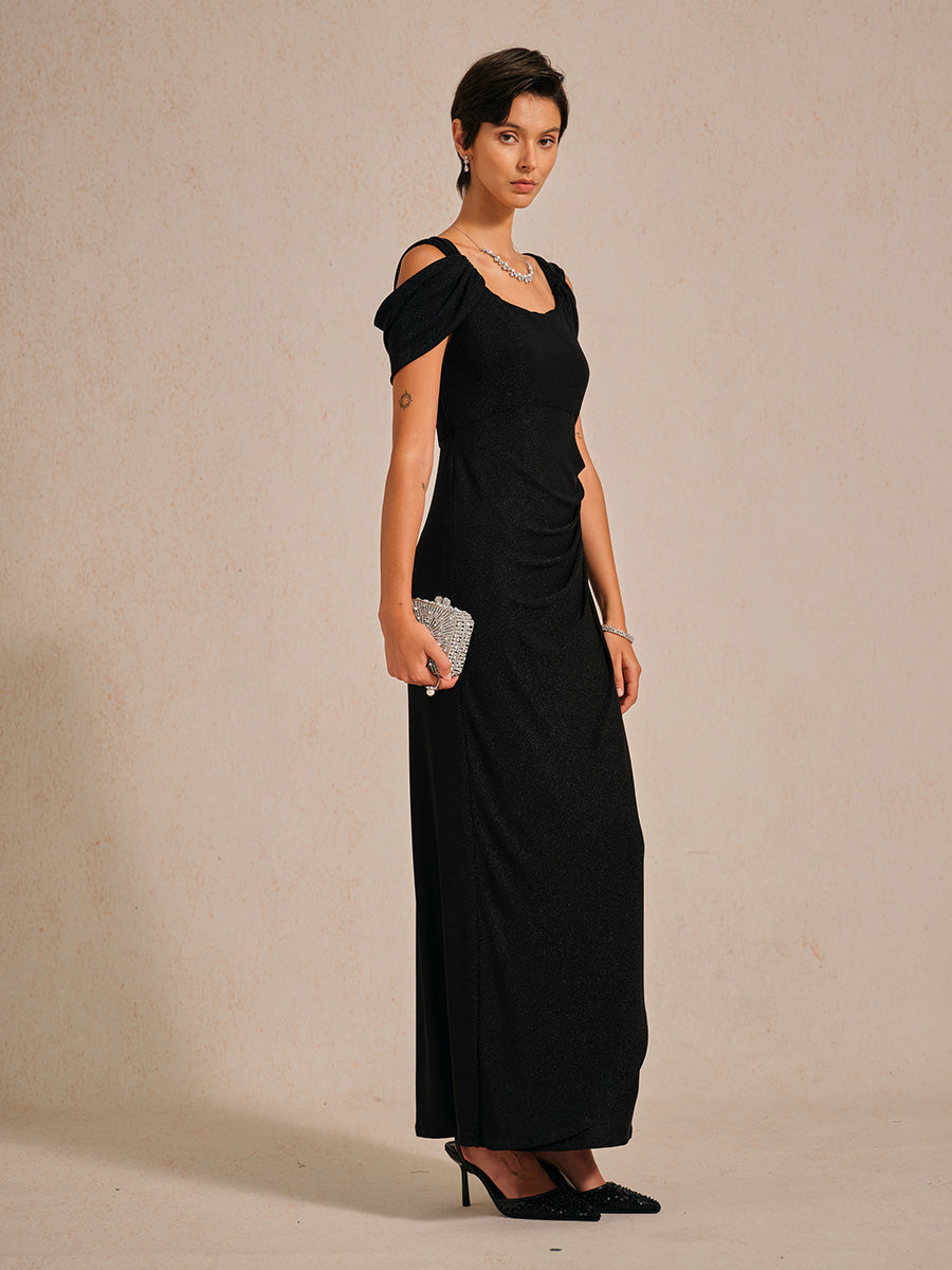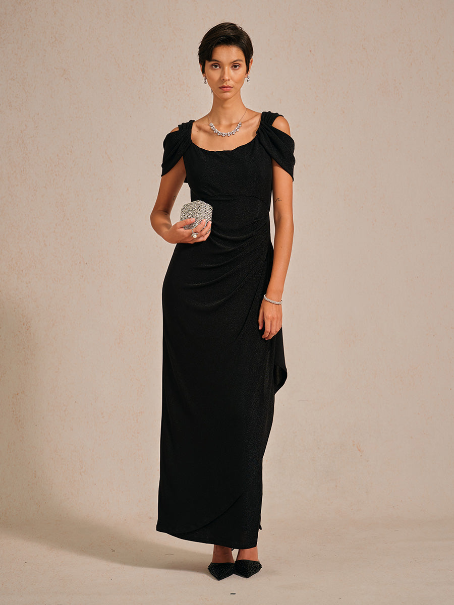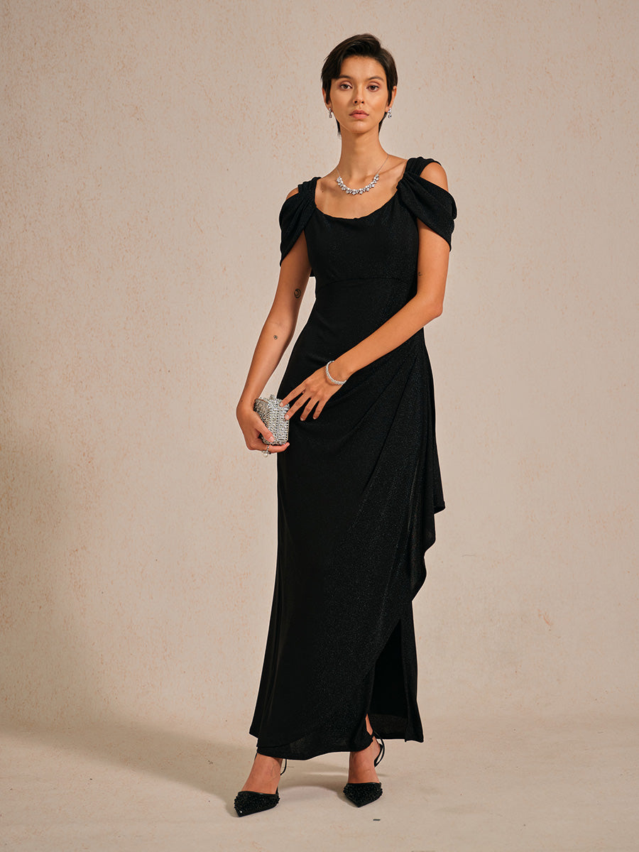 Turn heads in this stunning ankle-length metallic knit dress. Designed with cold shoulder sleeves and a graceful cowl neckline, the soft draped silhouette flatters your figure while adding elegant movement. A perfect choice for formal occasions, weddings, or special celebrations.