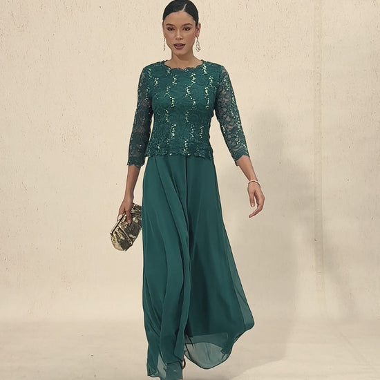 This refined floor-length dress creates the illusion of a two-piece ensemble with its dazzling sequin lace bodice and flowy chiffon skirt. Sheer lace sleeves offer graceful coverage, while scalloped edges at the neckline and cuffs add a soft romantic touch. Perfect for mothers of the bride or groom, this design exudes timeless elegance and effortless sophistication for weddings and formal gatherings.