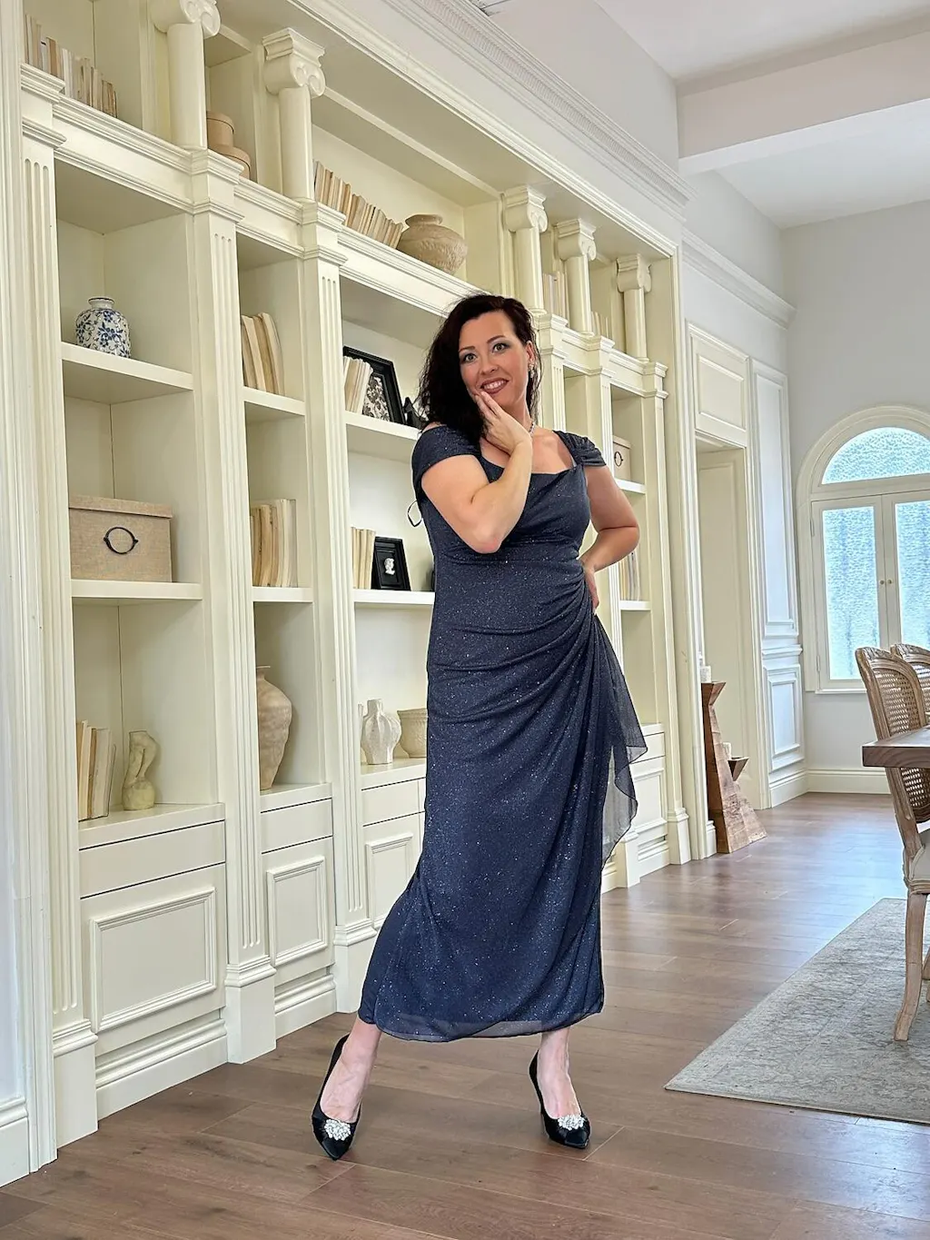 - Ontwerp: Cold shoulder mouwen, gedrapeerde roksilhouet, watervalhals, flatteuze taille, vloer lengte zoom