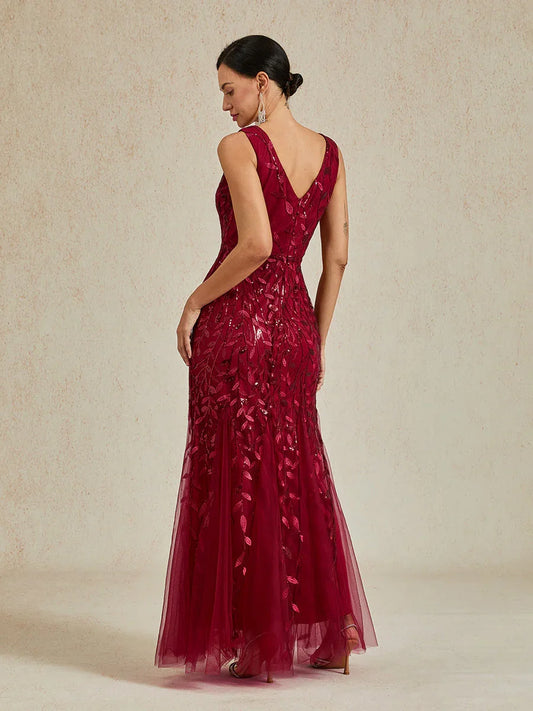 Perlebesatt paljett ermeløs V-hals havfrue kjole