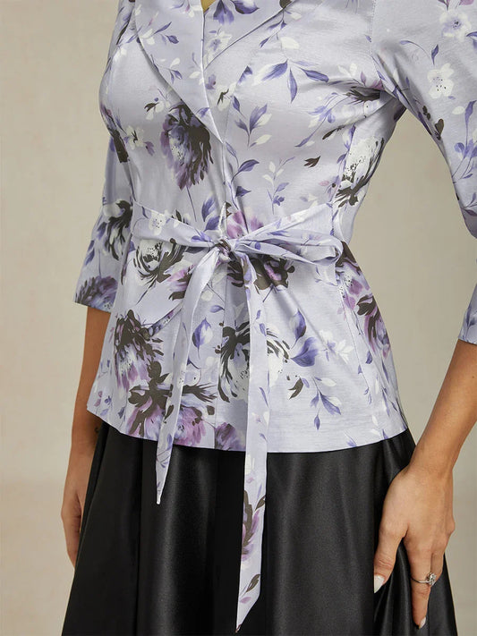 3/4 Sleeve Floral Jacquard Blouse with Tie Waist