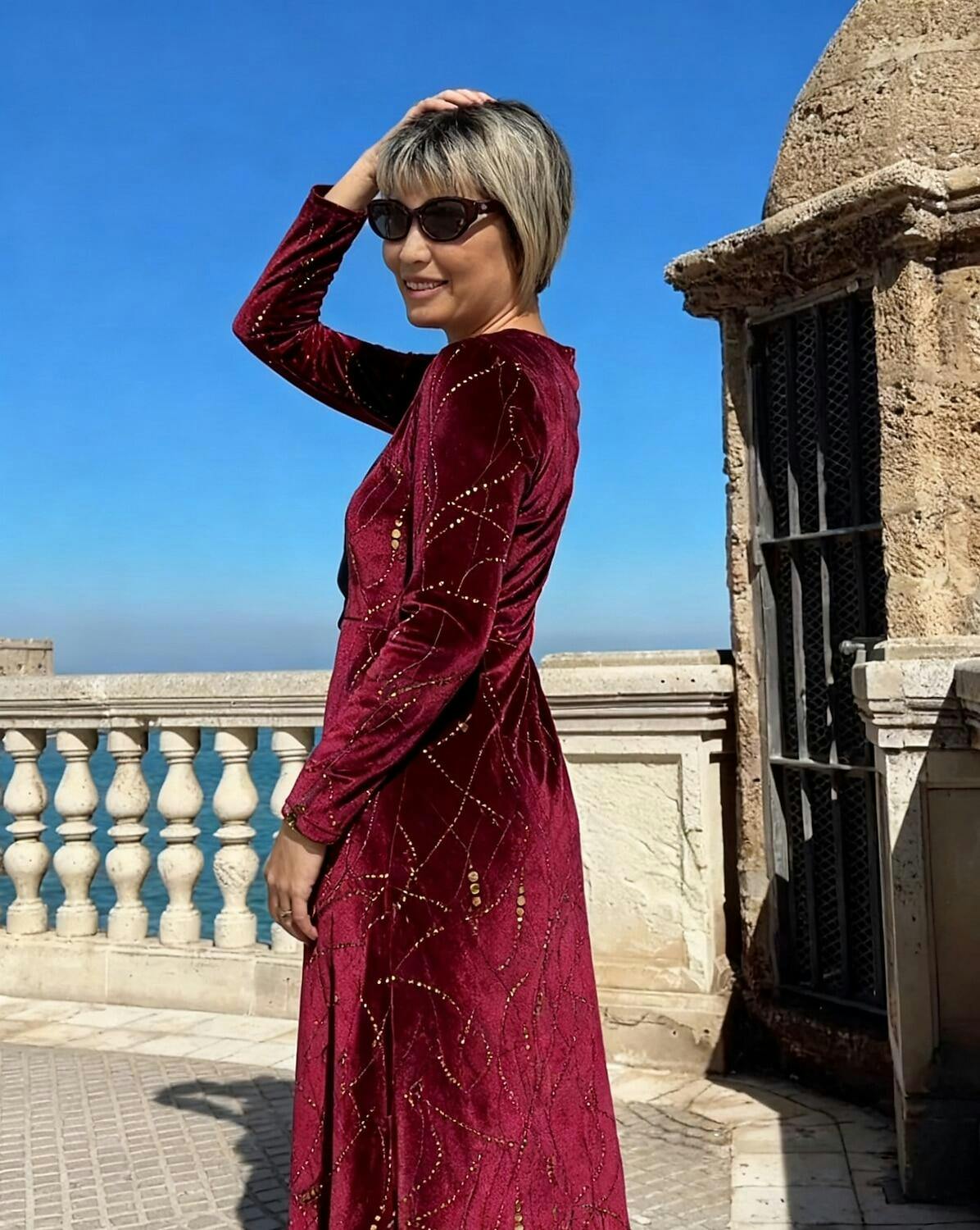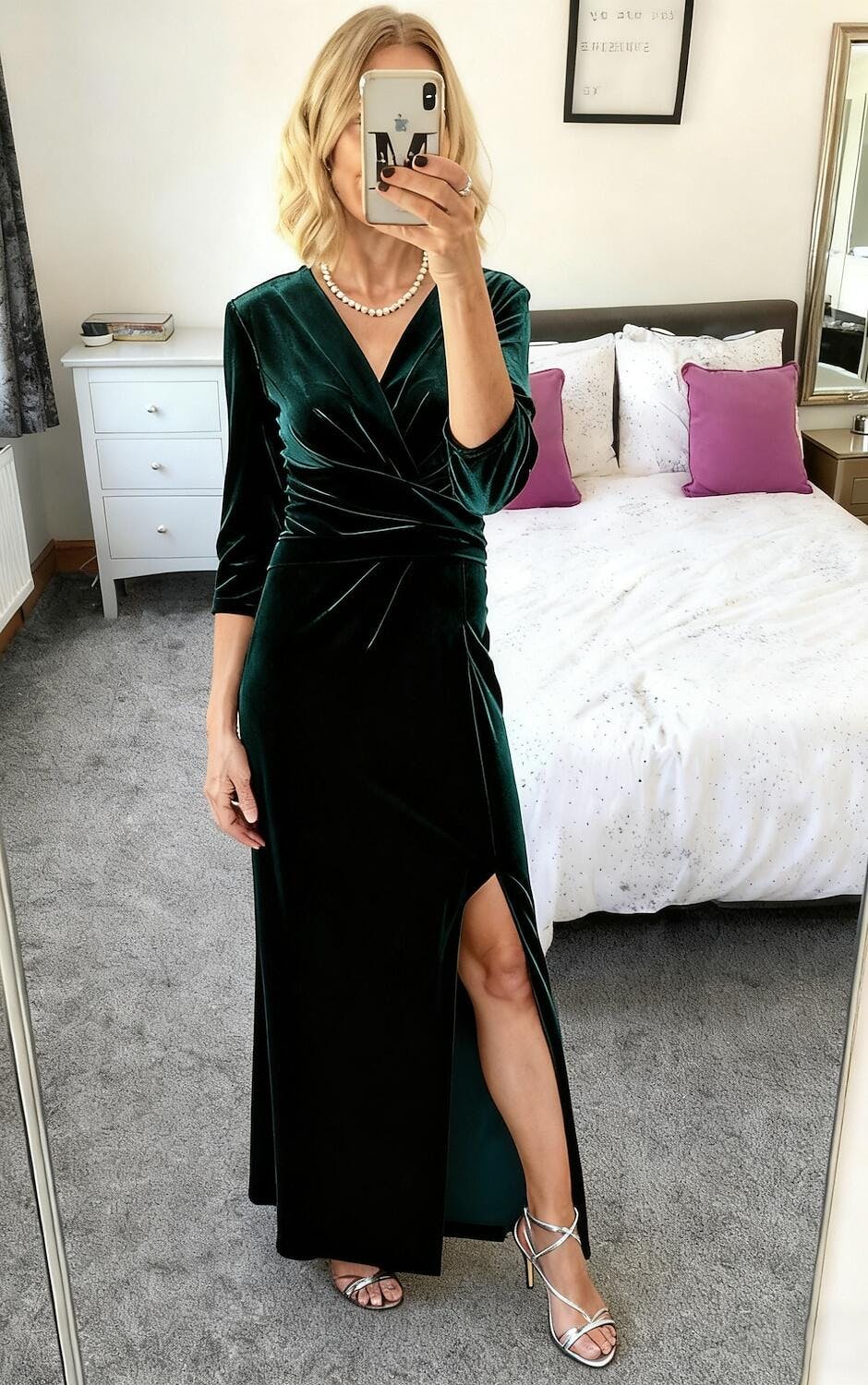 This dress is equal parts classy and sexy! The high slit isn't too revealing. The neckline is not too low. Sleeves are not too tight on the arms. Love the vintage vibes. I typically wear an XS or S, depending on the brand, and I'm glad I ordered a small. It's very comfortable and easy to move in. Highly recommend!