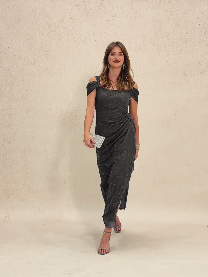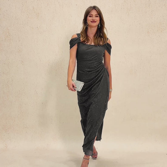Turn heads in this stunning ankle-length glitter mesh dress. Designed with cold shoulder sleeves and a graceful cowl neckline, the soft draped silhouette flatters your figure while adding elegant movement. A perfect choice for formal occasions, weddings, or special celebrations.This product will have a slight flash phenomenon. After receiving it, you can shake off the surface flash or spray it on the surface of the clothes with a styling spray.