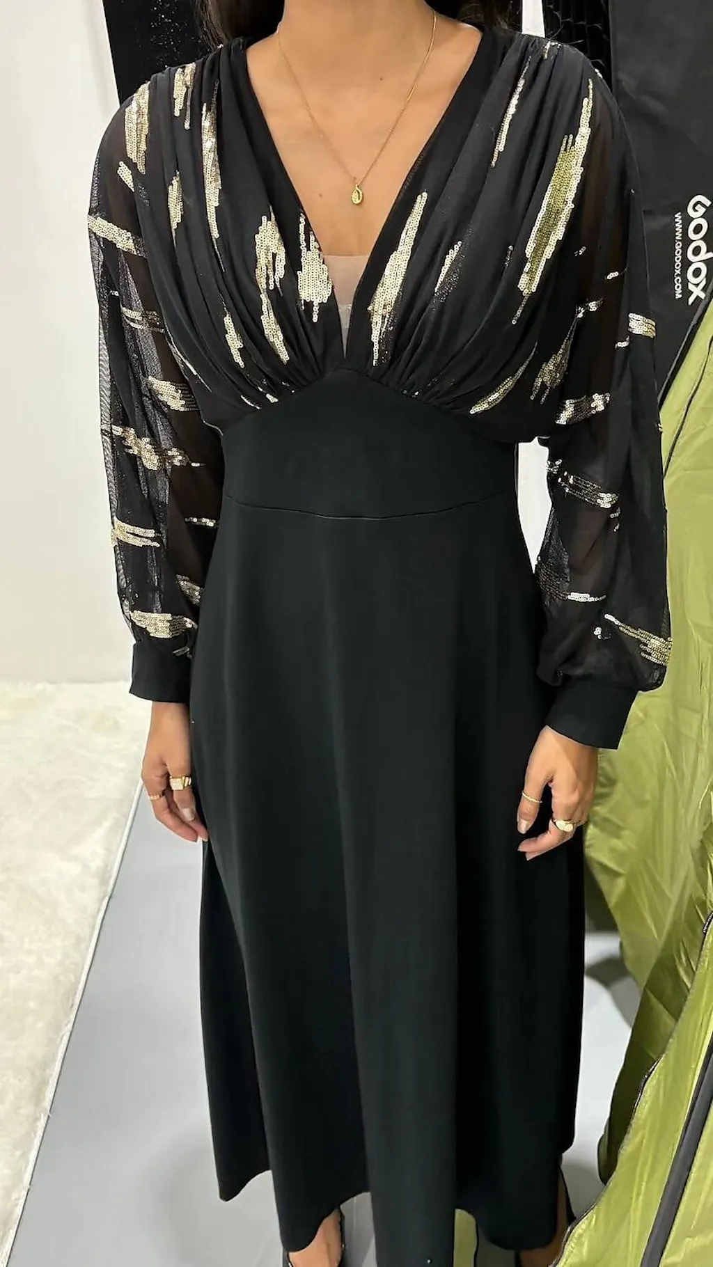 Black Sequins Puff Sleeve Maxi Dress with Empire Waist