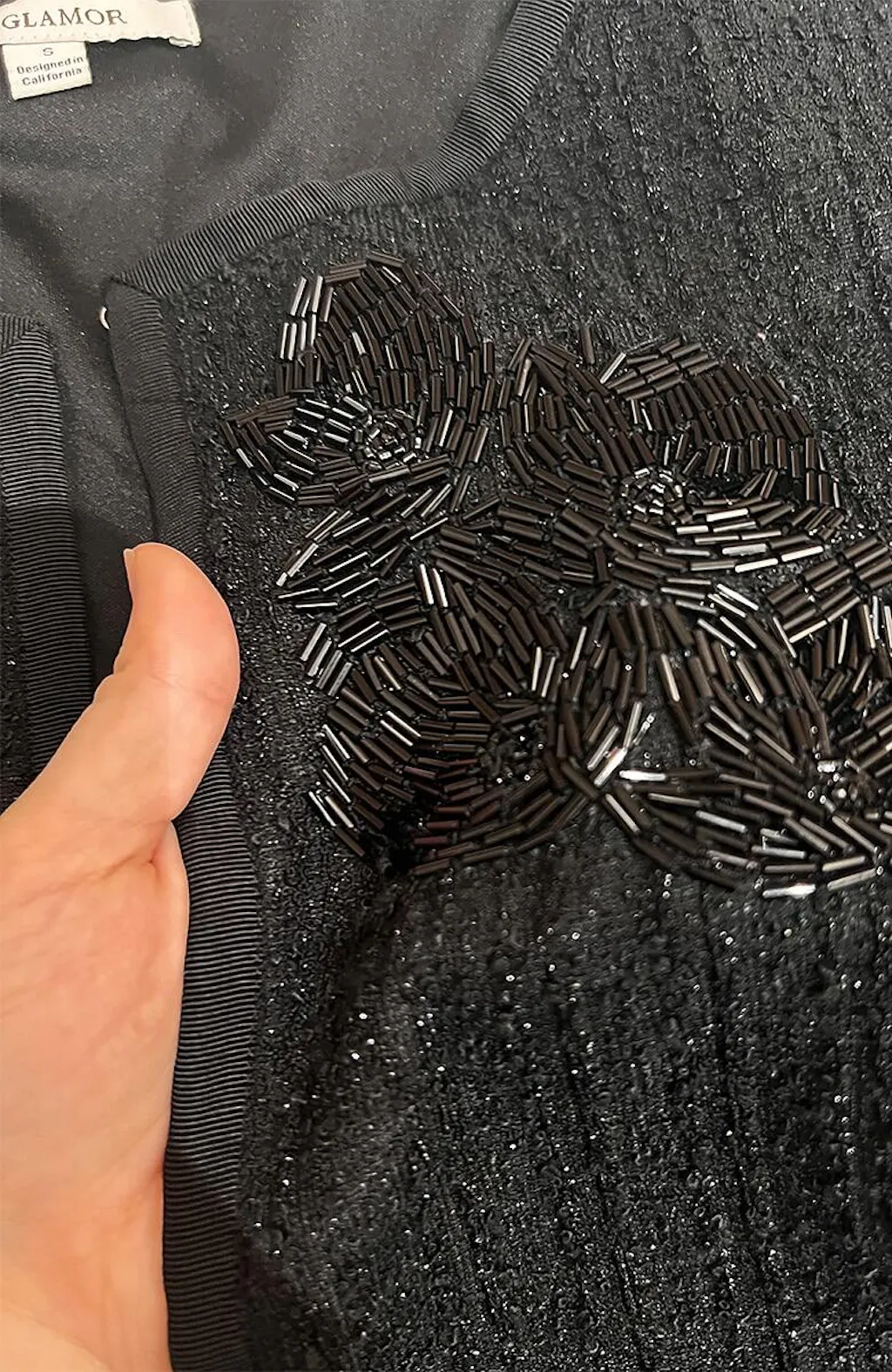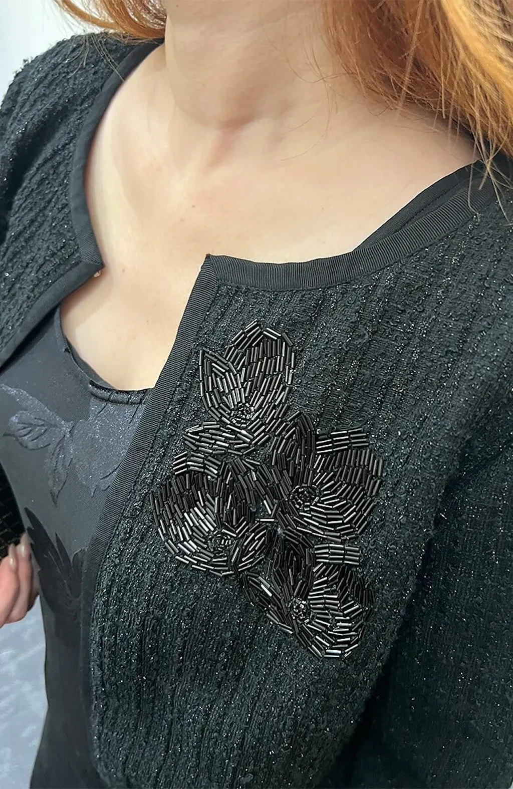 The cropped length hits just right at the waist. The beaded embroidery gives it a touch of elegance, I paired it with black pants for a chic look.