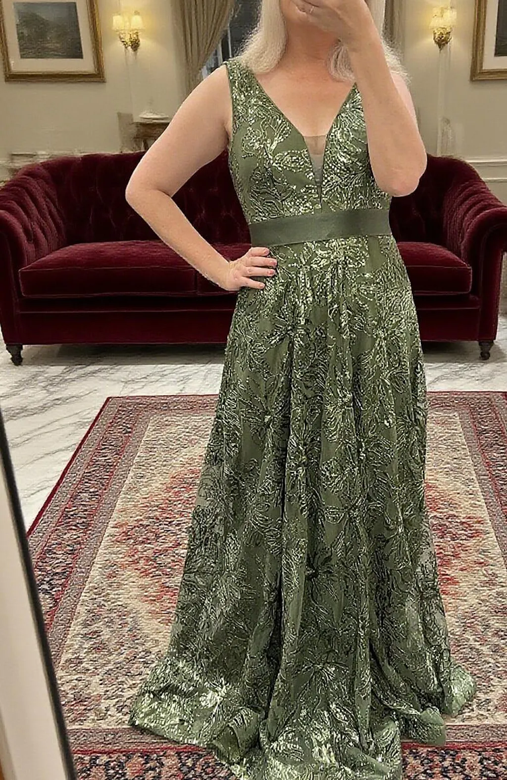 So many compliments on the dress! The color is unique, the sequins add nice pizzazz but not over powering. I'm 5'7", 205 and the XL fit perfectly. Maybe a little long for me but I didn't mind with heels. Great quality fabric.