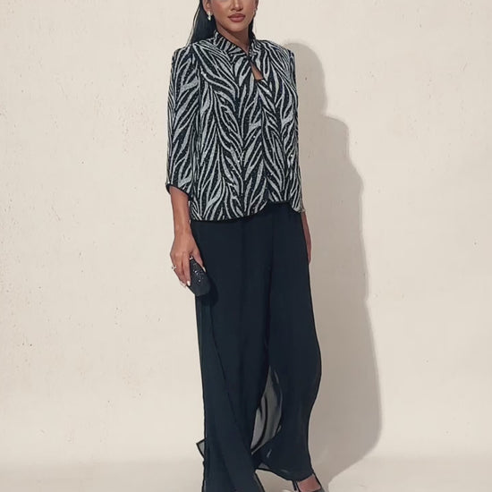 A dramatic evening set featuring a rhinestone-embellished zebra twinset and flowing split-leg pants. The top's bold pattern and open-front silhouette create eye-catching glamour, while the pants' sheer chiffon overlay adds graceful movement. Perfect for making a striking entrance at cocktail parties, formal dinners, and special celebrations.