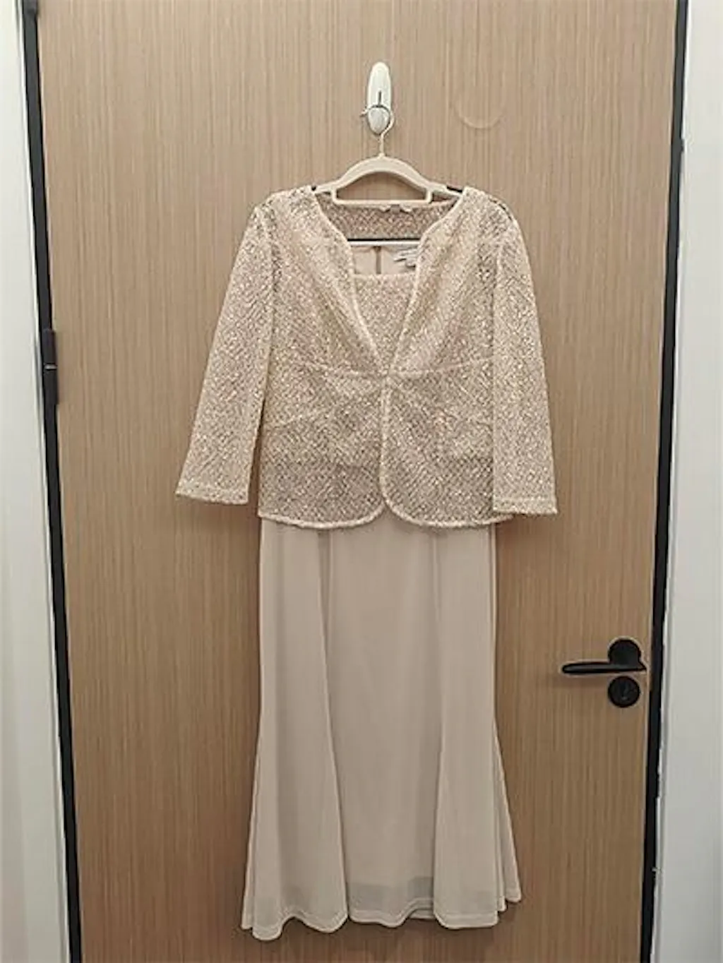 This chic jacket dress is the perfect choice for spring events. The mesh sequin 3/4 sleeve jacket adds a touch of glamour with subtle sparkle, fastened with diamond buttons for an elegant look. The sleeveless dress beneath features a soft knit lower half, providing comfort and stretch for a flattering fit. Ideal for weddings, parties, and cocktail gatherings, this piece is both stylish and comfortable, making it a go-to outfit for moms.