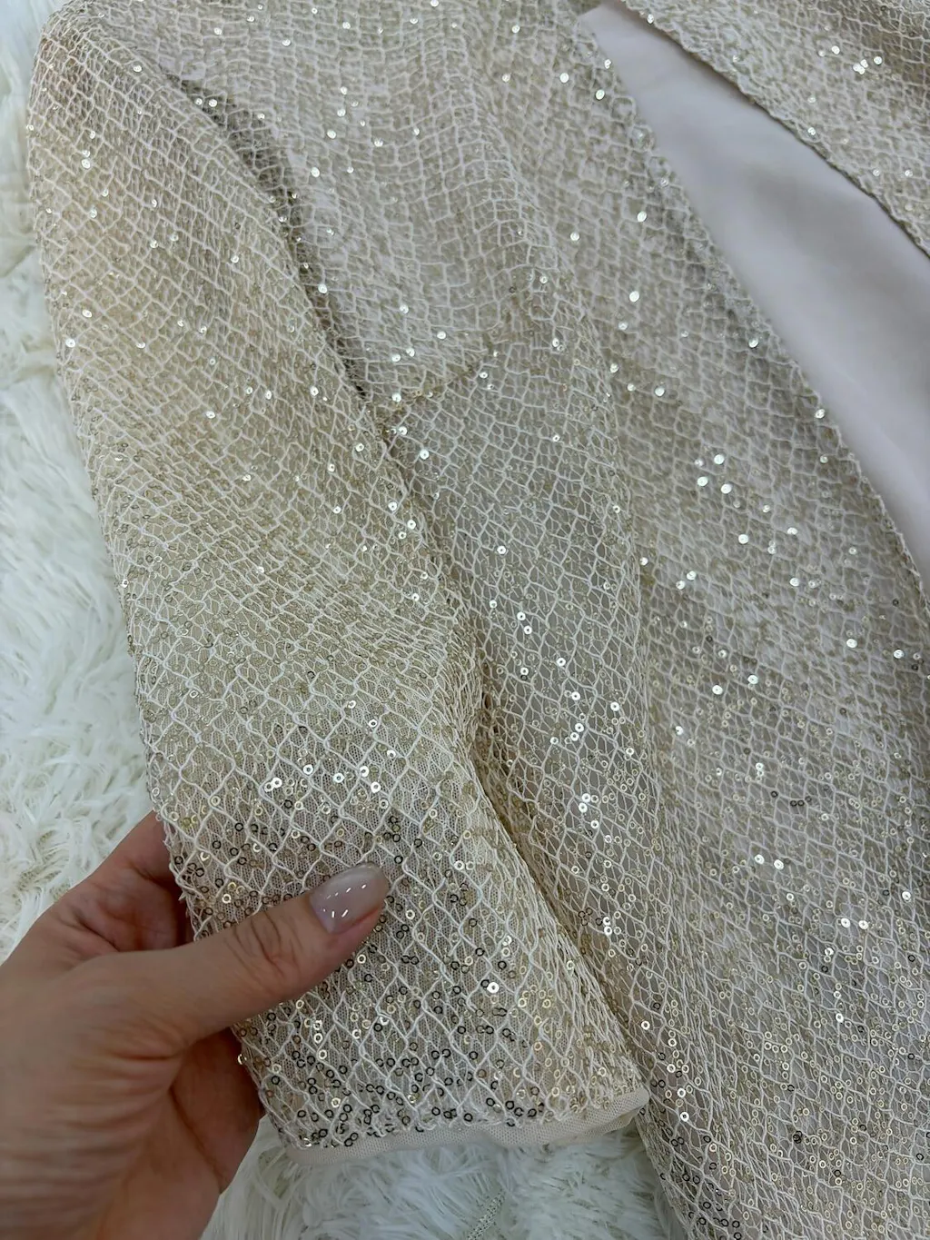 This stylish sequin mesh twinset combines a round neck 3/4 sleeve jacket with a sleek, comfortable vest underneath. The delicate sequin mesh fabric sparkles with every movement, adding an elegant touch to your outfit. The 3/4 sleeve jacket is perfect for layering over dresses or separates, while the vest offers a simple, yet refined look. Ideal for formal gatherings, evening parties, or cocktail events, this twinset is a versatile and chic addition to your wardrobe.