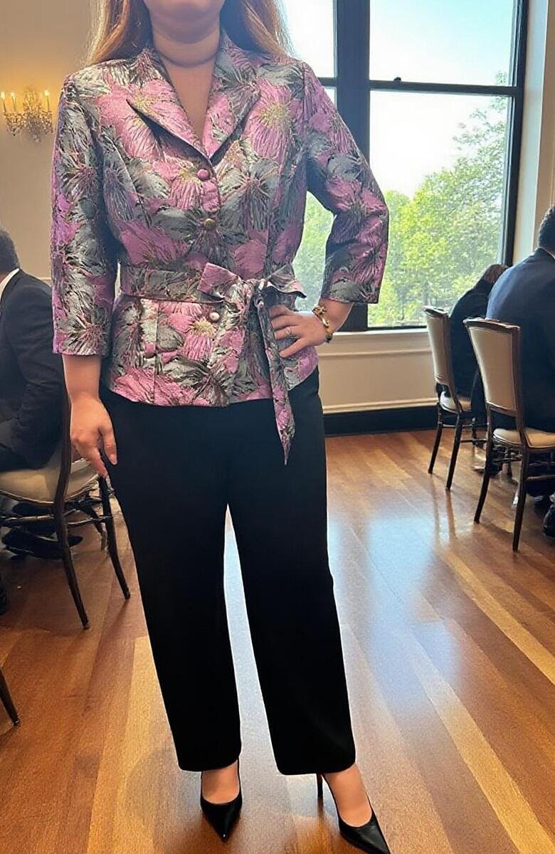 - Fabric: Floral jacquard with metallic threads, Glossy finish, Non-stretch body fabric, Soft stretch lining