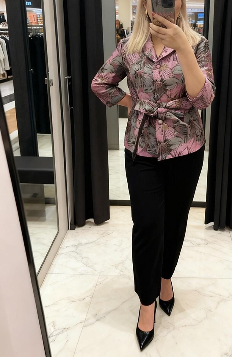 This 3/4 sleeve floral jacquard blouse is designed with a structured collar, front button closure, and a flattering tie waist. The fabric features floral jacquard with metallic threads, giving it a refined sheen and crisp texture. While the outer fabric has no stretch, the soft stretch lining ensures comfort. Perfect for work, dinners, or special gatherings, this blouse brings both elegance and structure to your look.
