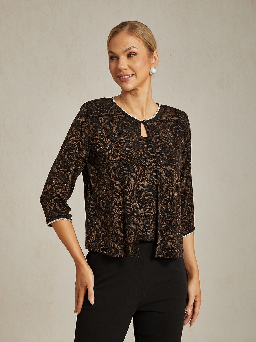 This 3/4 sleeve metallic knit mock twinset blends sparkle with sophistication. Crafted in a high-stretch knit with delicate floral patterns and shimmering metallic details, it offers both comfort and style. Designed with soft shoulder pads for structure and decorative knit trim at the neckline and cuffs, this twinset creates an effortlessly polished look. The layered mock design adds versatility, making it ideal for both work and evening occasions.