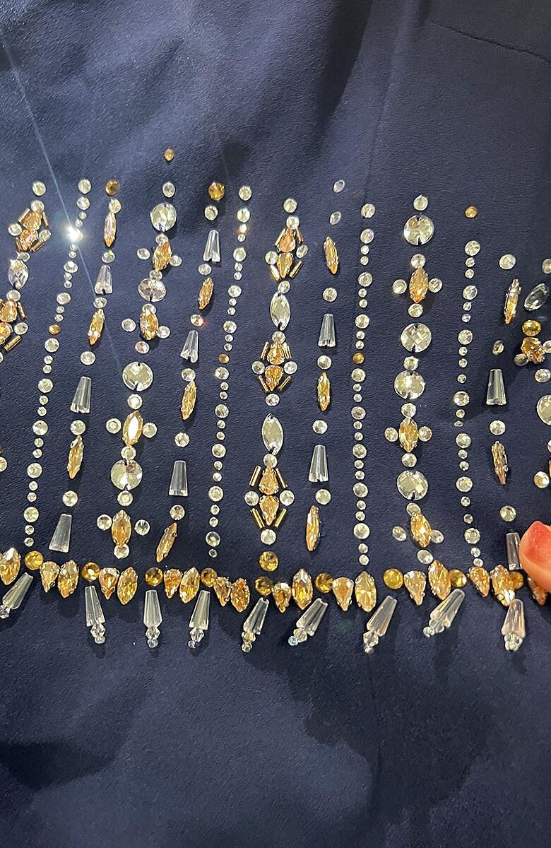 - Design: Boat Neck, Mermaid Silhouette,Crystal Embellishments, Shoulder Pads, Back Zipper?