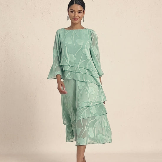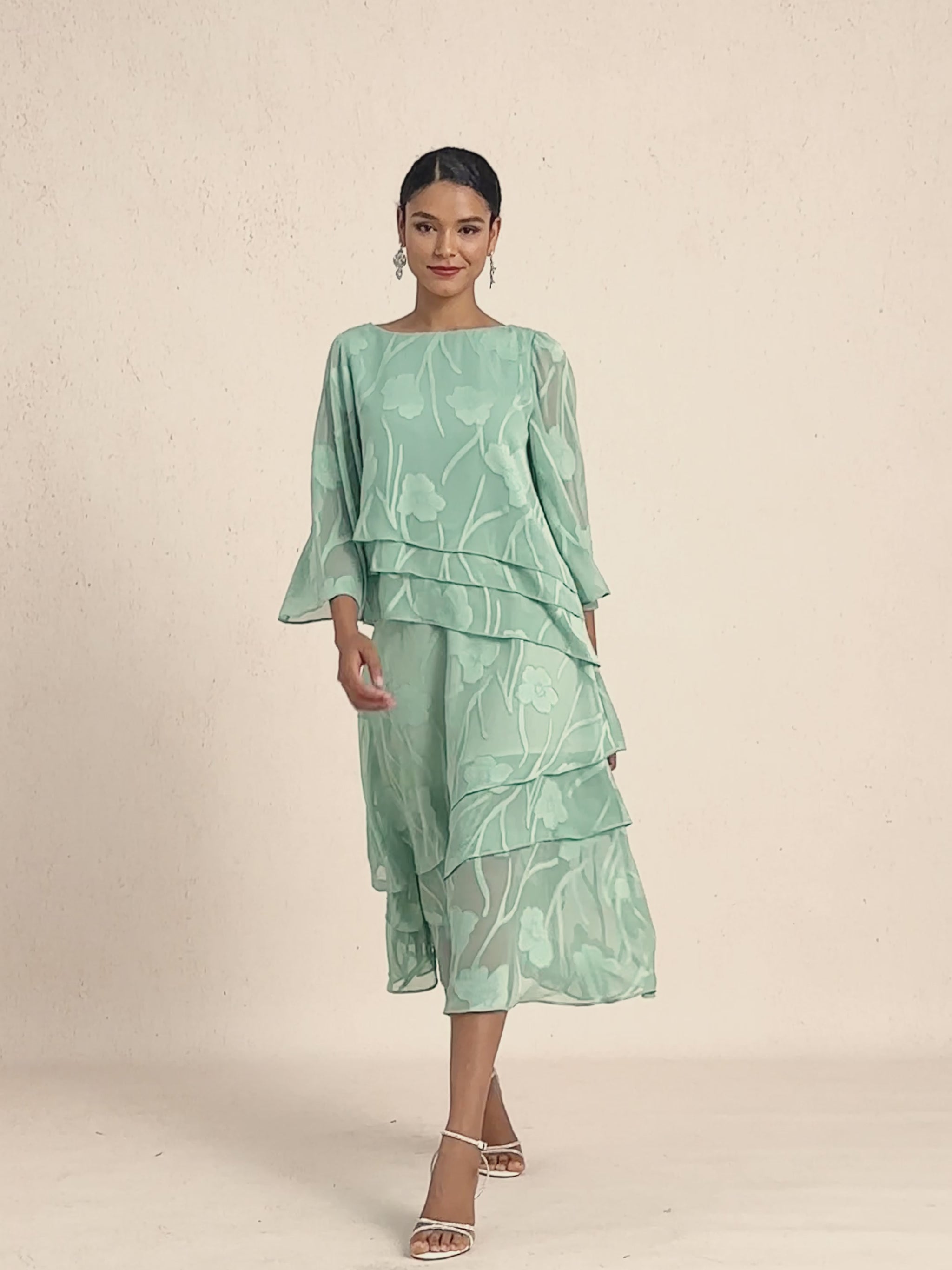 Relaxed fit with a round neckline, cape-style layered sleeves, and floral detailing for an elegant, feminine silhouette -