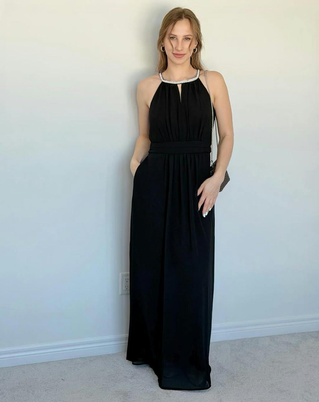 Chiffon Pearl Halter Neck Floor-Length Dress with Wrinkle Resistant chiffon