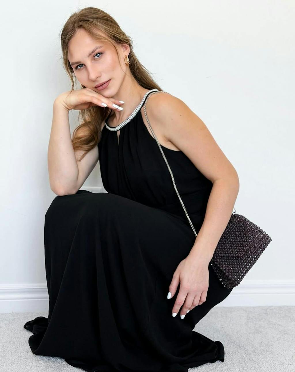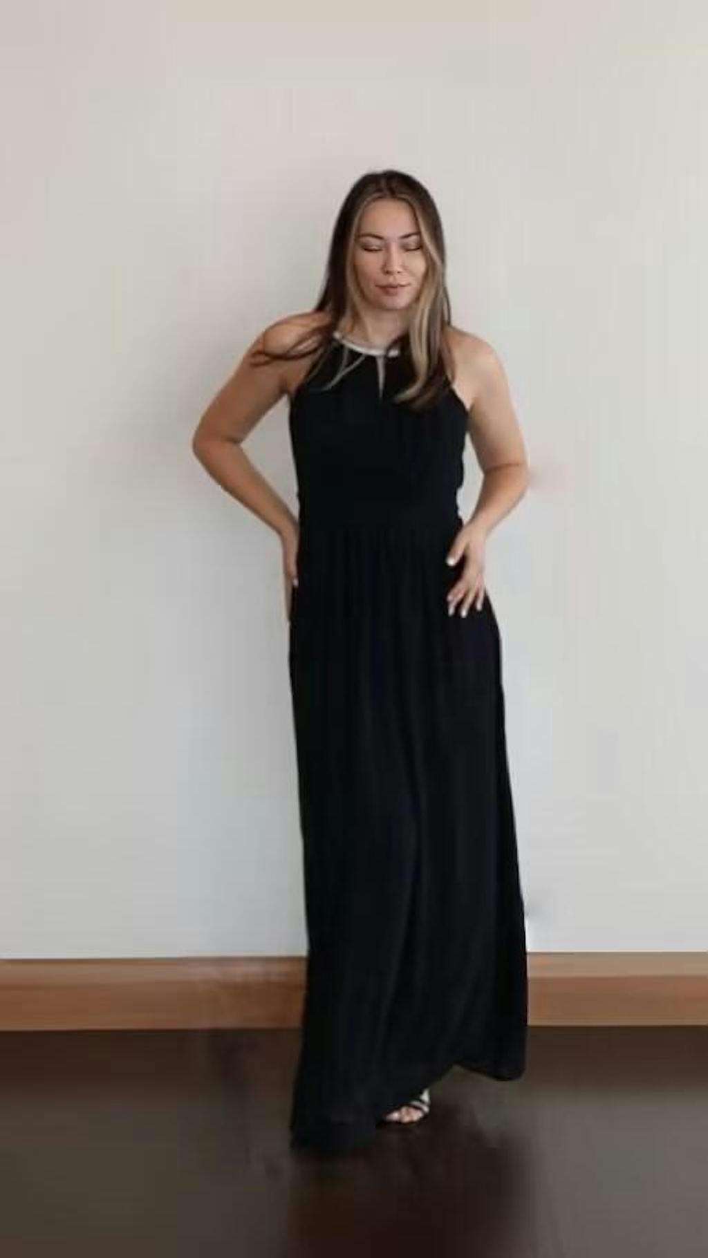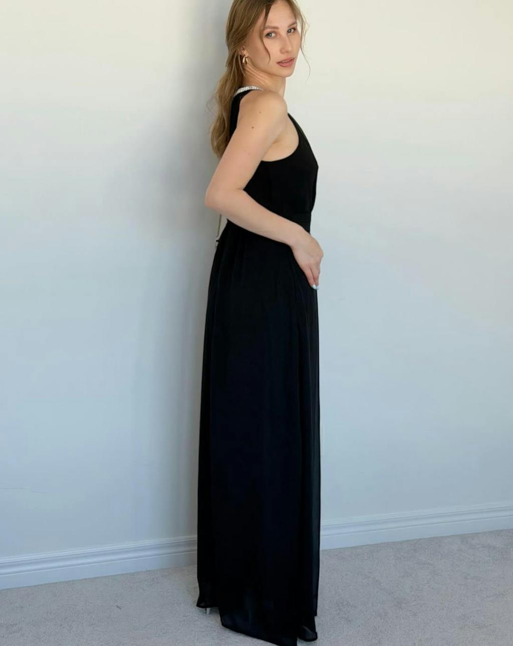 This elegant halter neck dress features a flattering waist pleating design and a graceful A-line silhouette that flows to a floor-length hem. Crafted from wrinkle-resistant chiffon fabric, it is perfect for all-day wear, while the soft knit lining ensures comfort and a smooth fit. The pearl detail at the neckline adds a touch of refined elegance. Ideal for a wedding guest, this dress combines sophistication and comfort, making it the perfect choice for any formal occasion.