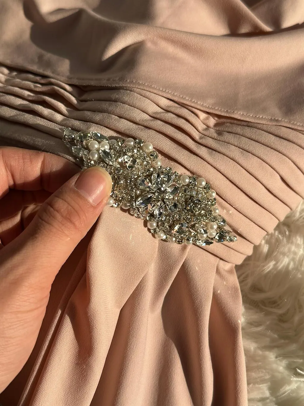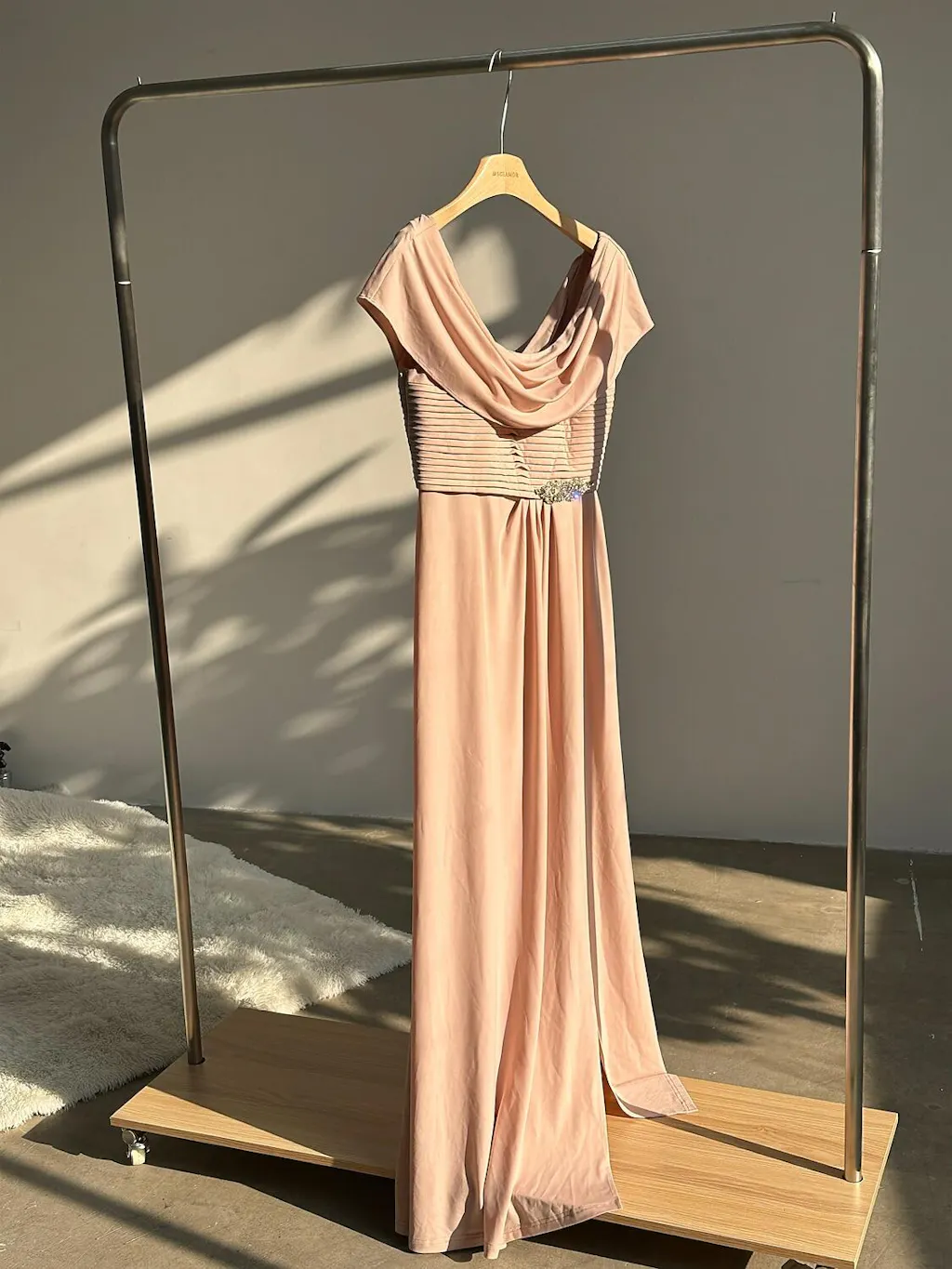 - Design: Long cowl neck, pleated bodice, cowl back, waist embellishment