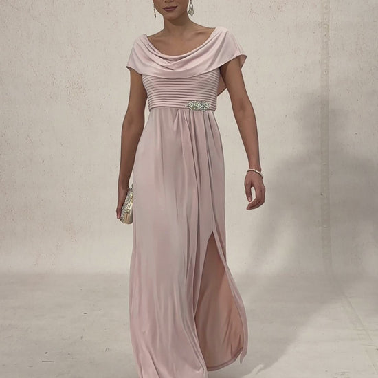 Draped Neck Jersey Evening Dress with Pleated Bodice