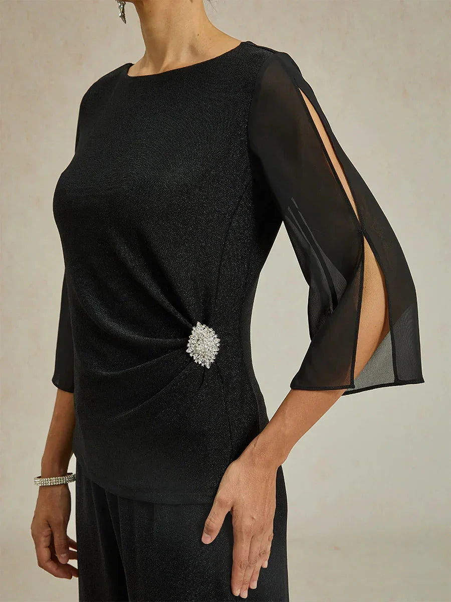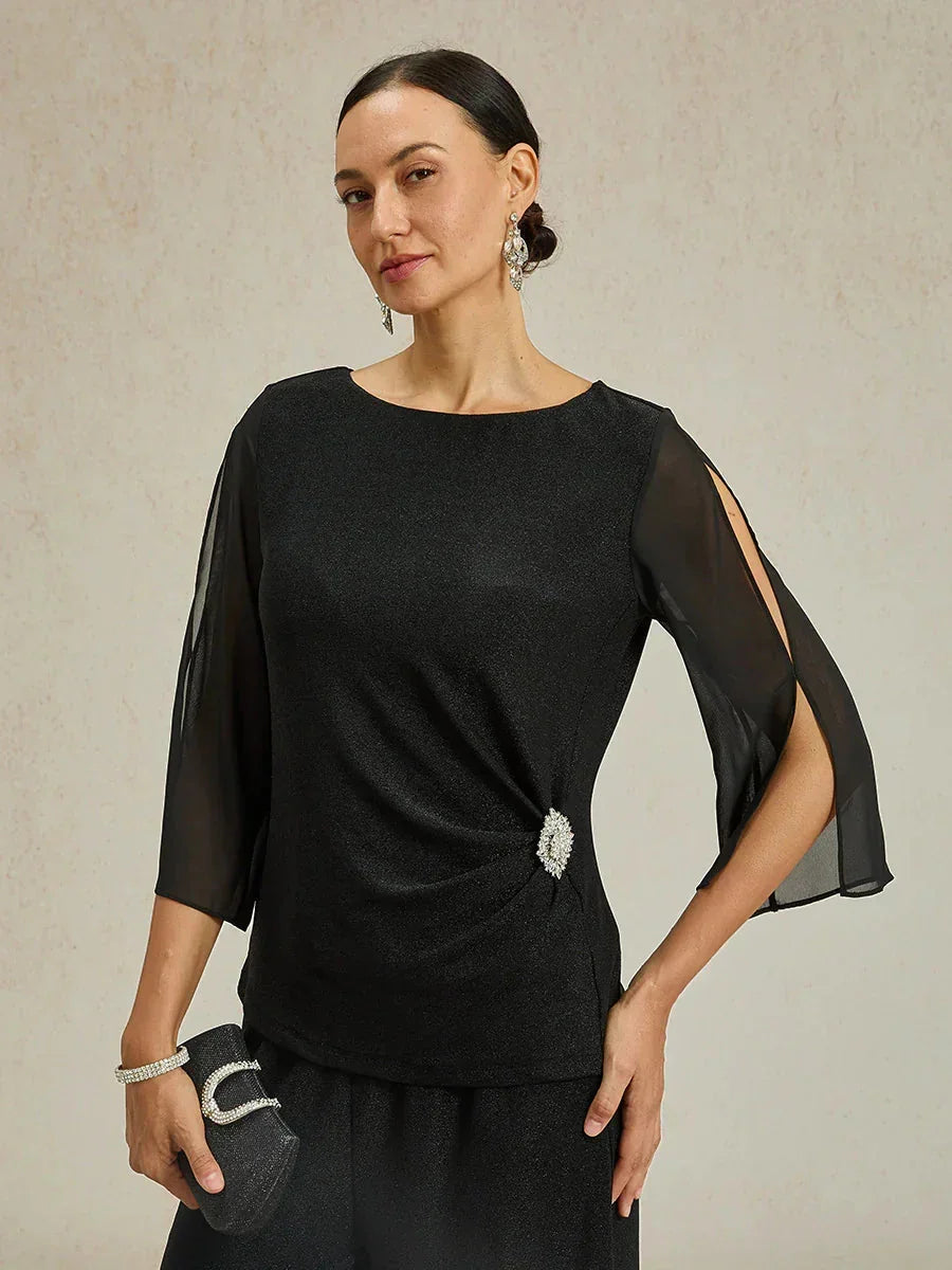 This sophisticated 3/4 sleeve blouse highlights intricate beaded detailing at the hip and delicate illusion chiffon sleeves for an elegant look. Made from our shimmering metallic knit fabric, it offers comfortable stretch and pairs beautifully with matching metallic knit or chiffon pants. Versatile and stylish, it is perfect for both casual and formal occasions, adding a refined touch to any wardrobe.