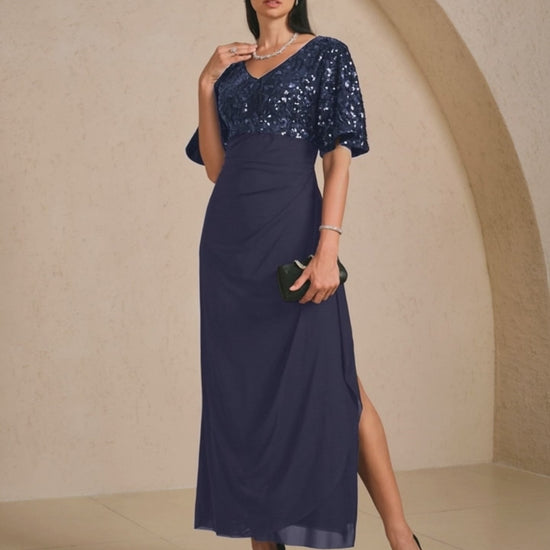Sparkle and shine in this stunning embroidered sequin gown featuring an empire waist, flutter sleeves, and a cascading skirt. The mesh fabric overlay adds delicate texture while the embellished bodice creates a dazzling effect. Designed for comfort and elegance, this dress is perfect for weddings, proms, cocktail parties, and formal evening events. Pair with understated accessories for a polished, sophisticated look.