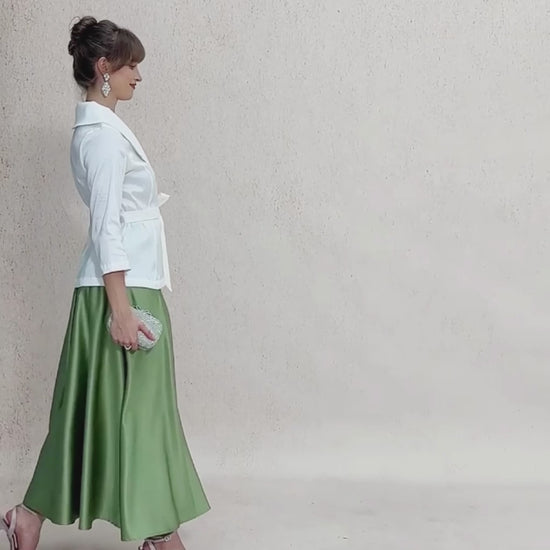 A stunning formal set featuring an elegant stretch taffeta blouse paired with a luxurious satin ballgown skirt. The top offers an asymmetric silhouette with a structured collar and tie-front waist, while the skirt's structured inverted pleats create graceful volume. Together, they create a perfectly coordinated and polished look for special events and elevated evenings.