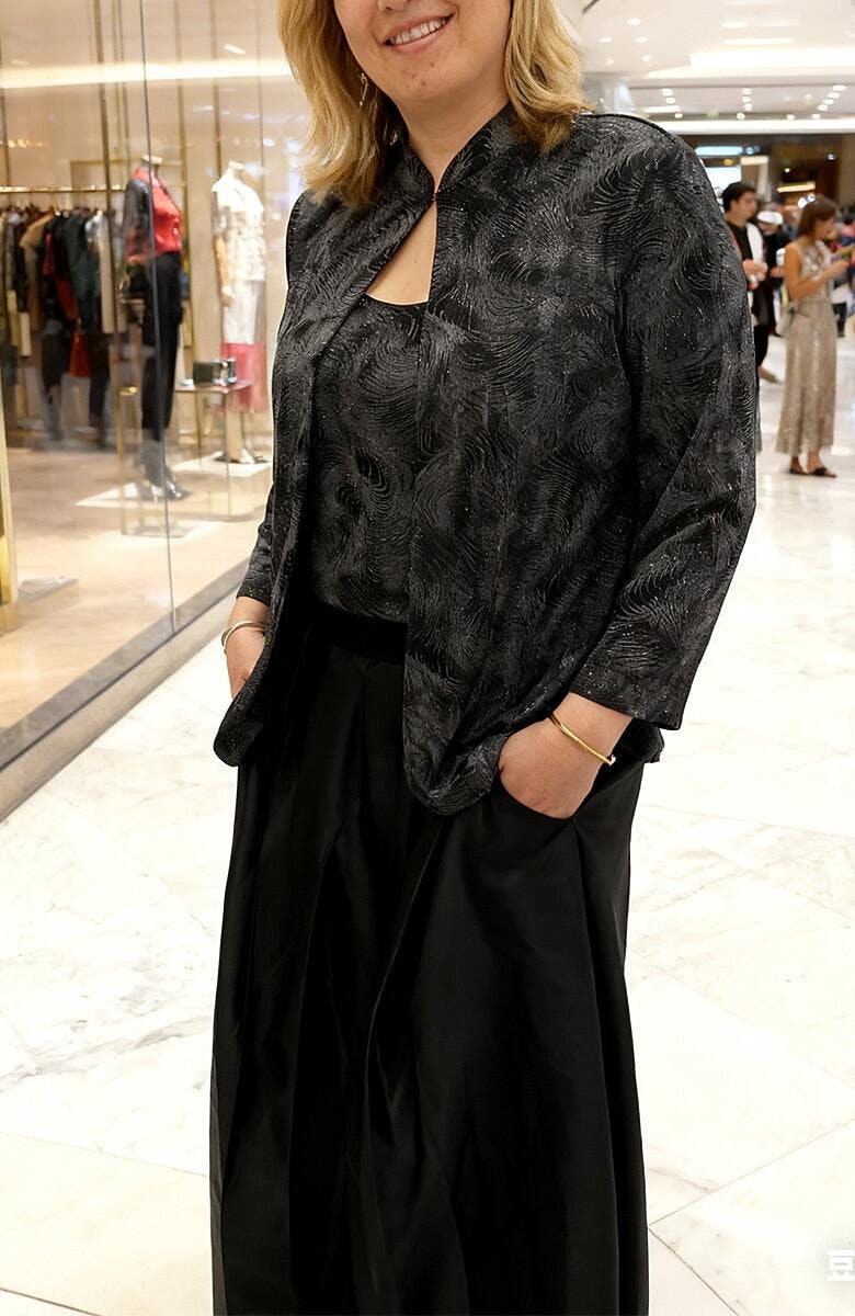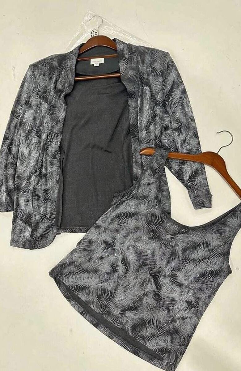 - Design: Twinset blouse and tank, Padded shoulders, Scoop neck tank, Mandarin neck jacket, 3/4 length sleeves, Printed glitter knit