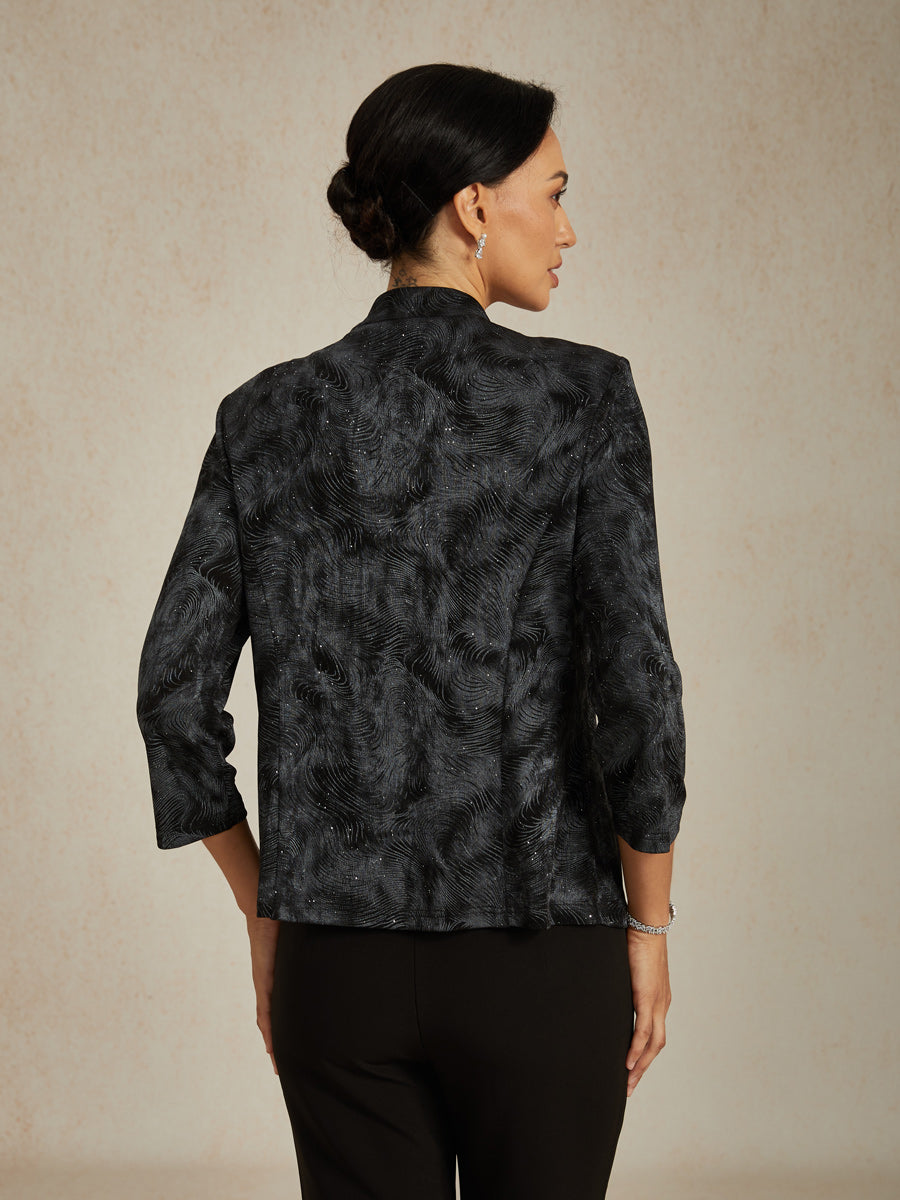 This sparkling twinset combines a soft, high-stretch scoop neck tank with a chic 3/4 sleeve jacket featuring a mandarin neck closure. Padded shoulders and a coordinated two-piece design create a polished, stylish look that¡¯s perfect for weddings, cocktail parties, formal gatherings, or festive occasions.